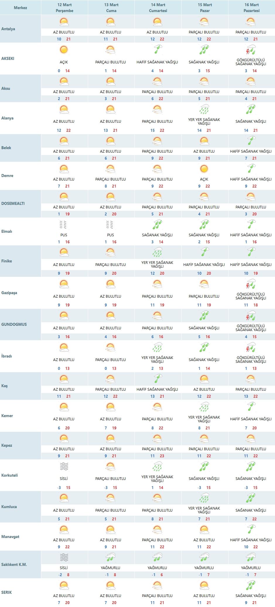 Kıyı şeridinde yer alan ilçelerde sıcaklıklar mevsim normallerinin üzerinde seyrediyor. Alanya ve Manavgat 22 derecelik en yüksek sıcaklıklarla günün en sıcak noktaları olurken; Aksu, Belek, Demre, Kaş, Kepez ve Kumluca 21 dereceyle bu sıcaklığı takip edecek. Serik ve Kemer'de ise termometrelerin 20 dereceyi, Finike ve Gazipaşa'da ise 19 dereceyi göstermesi bekleniyor. Döşemealtı ilçesinde ise az bulutlu gökyüzüyle beraber sıcaklık 19 derece seviyesinde kalacak.