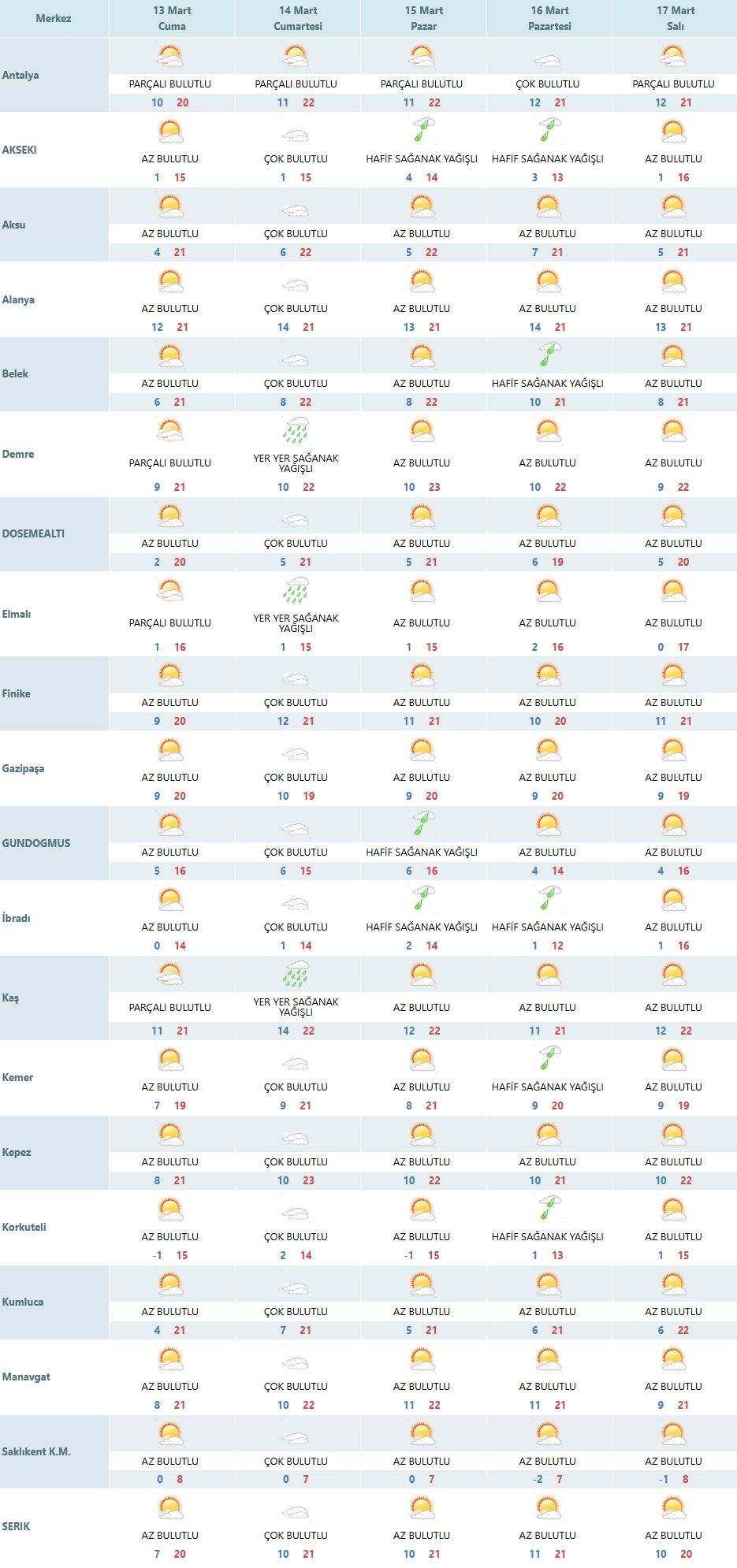 Antalya’da 13 Mart Cuma günü için hava durumu tahminleri belli oldu. Meteoroloji verilerine göre kent genelinde parçalı bulutlu bir hava etkili olacak. Gün içerisinde sıcaklıkların 20 derece civarına kadar yükselmesi beklenirken gece saatlerinde sıcaklık 10 derece civarına kadar düşecek. Antalya merkez ve birçok ilçede yağış beklenmezken, bazı iç kesimlerde kısa süreli sağanak ihtimali de bulunuyor. Mart ayının ortalarına yaklaşılırken Antalya’da hava genellikle ılık ve bahar havasında seyrediyor. Uzmanlar özellikle sabah ve akşam saatlerinde serinliğe karşı vatandaşların tedbirli olması gerektiğini belirtiyor.