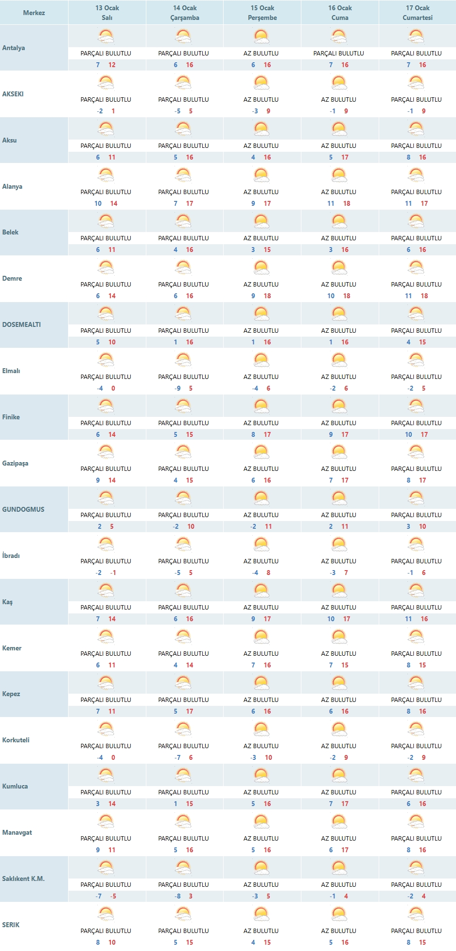 13 Ocak Salı günü Antalya merkezde hava parçalı bulutlu olacak. Günün en düşük sıcaklığı 7 derece, en yüksek sıcaklığı ise 12 derece olarak ölçülecek. Sabah saatlerinde serin bir hava hissedilirken, öğleye doğru sıcaklıkların yükselmesiyle birlikte daha ılıman bir atmosfer oluşması bekleniyor. Nem oranının dengeli seyretmesi, kent merkezinde günlük yaşamı olumsuz etkileyecek bir durum yaratmıyor. Rüzgarın ise hafif esmesi öngörülüyor. Bu tablo, açık havada vakit geçirmek isteyenler için genel olarak elverişli bir gün anlamına geliyor.