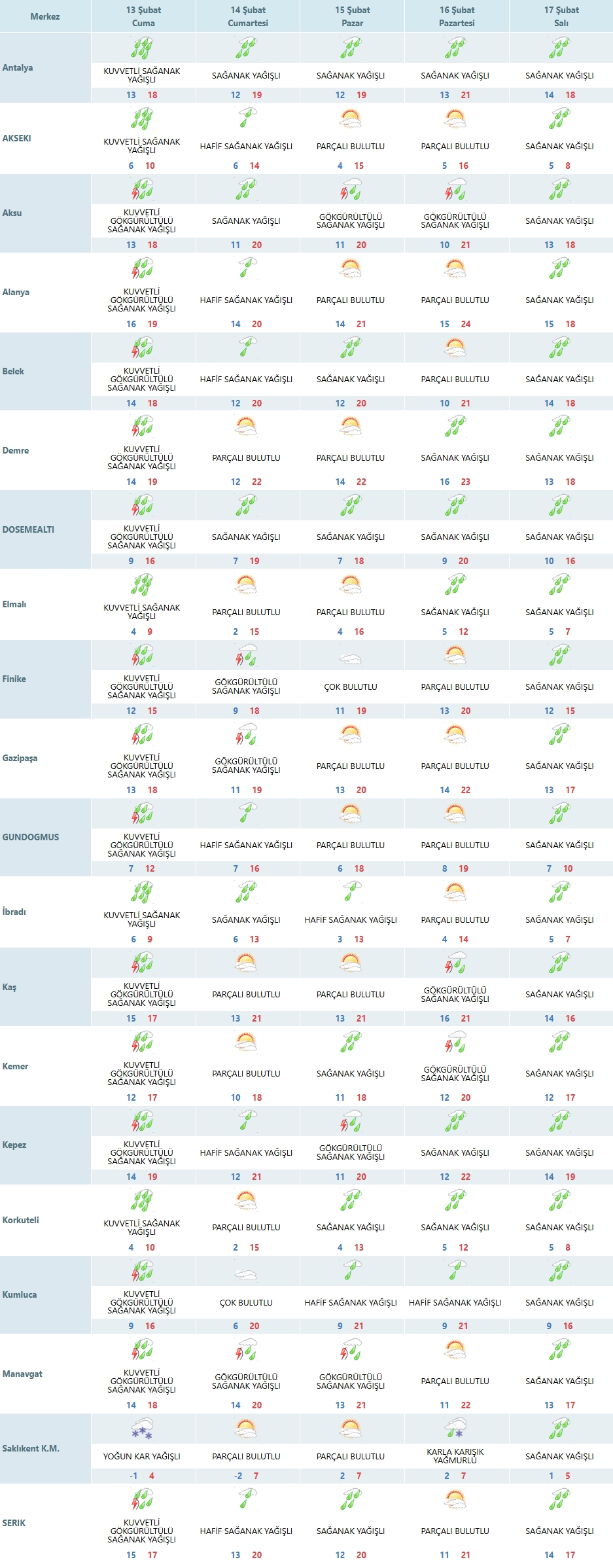 Meteoroloji Genel Müdürlüğü'nün en taze verilerine göre, 13 Şubat Cuma günü Antalya için "tedbir" günü olmaya devam ediyor. Şehrin hemen hemen her noktasında yağışlar "kuvvetli" seviyede seyredecek.