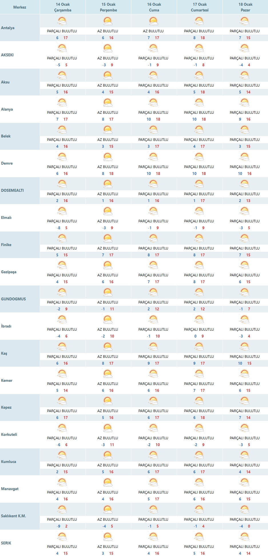 Antalya’nın iç ve yüksek rakımlı ilçelerinde ise 14 Ocak Çarşamba günü hava durumu daha sert. Akseki’de sıcaklık -5 dereceye kadar düşerken, günün en yüksek değeri 5 derece civarında kalıyor. Elmalı’da da benzer şekilde gece -8 derece ölçülürken, gündüz sıcaklığı 5 dereceye kadar yükseliyor.
