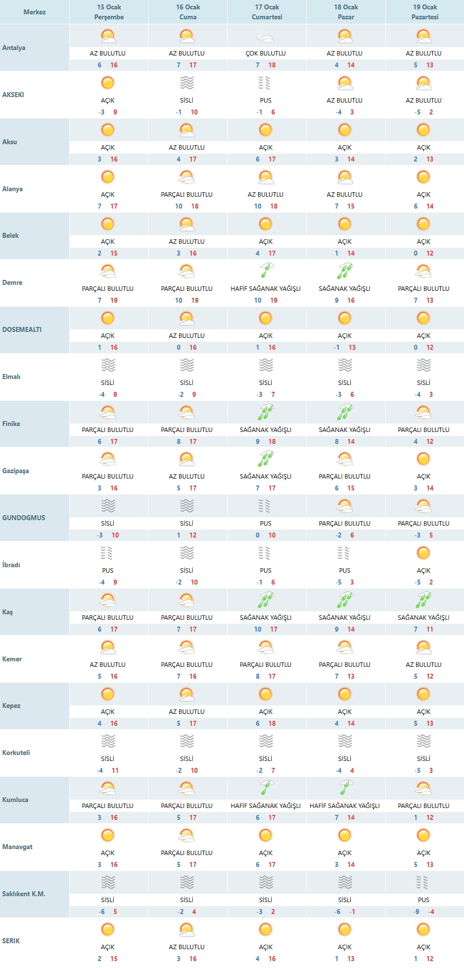 Buna karşılık Akseki, Elmalı, Korkuteli, Gündoğmuş ve Saklıkent Kayak Merkezi gibi yüksek kesimlerde soğuk daha etkili. Bu bölgelerde sıcaklıklar gece saatlerinde -3 ila -6 dereceye kadar düşerken, sis ve pus görülmesi bekleniyor. Sürücülerin özellikle sabah erken saatlerde dikkatli olması gerekiyor.