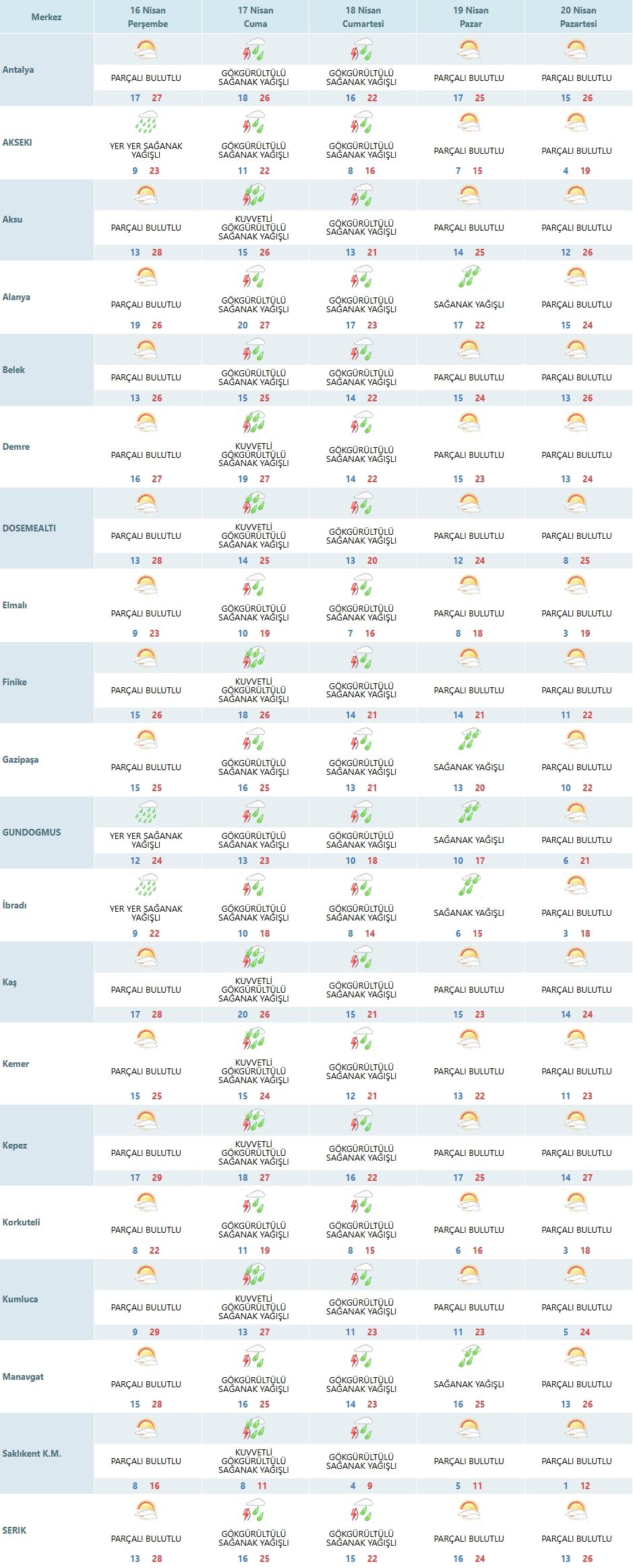 Her ne kadar genel tablo parçalı bulutlu olsa da bazı iç kesimlerde kısa süreli yağış ihtimali bulunuyor. Akseki’de yer yer sağanak yağış beklenirken sıcaklık 9 ila 23 derece arasında değişiyor. Gündoğmuş ve İbradı gibi bölgelerde de benzer şekilde yerel yağış geçişleri görülebilir.