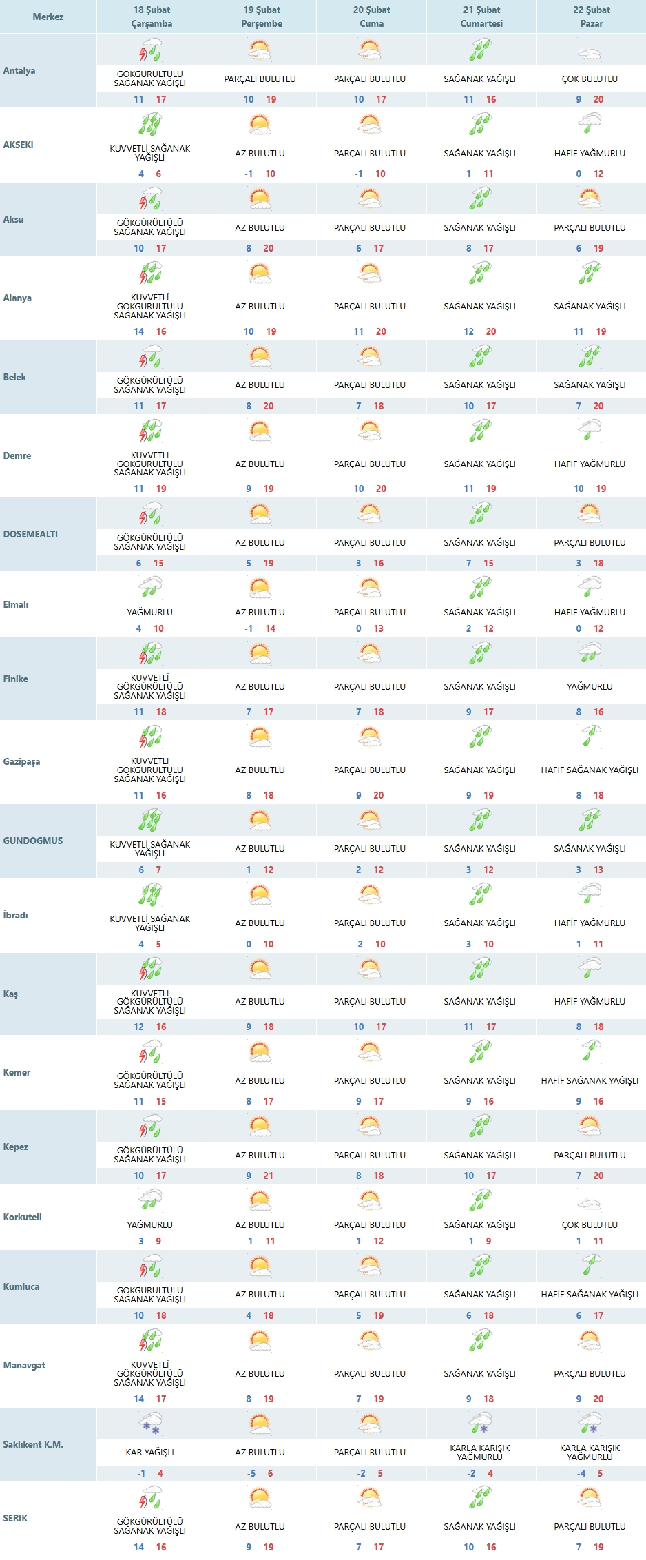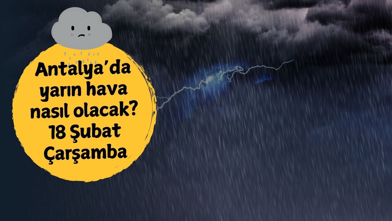 Meteoroloji Genel Müdürlüğü'nden alınan son verilere göre Antalya genelinde 18 Şubat Çarşamba günü yağışlı havanın etkisini sürdürmesi beklenmektedir. Şehir merkezinde gök gürültülü sağanak yağışın etkili olacağı tahmin edilirken, hava sıcaklığının en düşük 11, en yüksek 17 derece civarında seyretmesi öngörülmektedir. Aksu, Belek, Döşemealtı, Kemer, Kepez, Kumluca ve Serik ilçelerinde de gün boyu gök gürültülü sağanak yağışların görülmesi beklenmektedir.