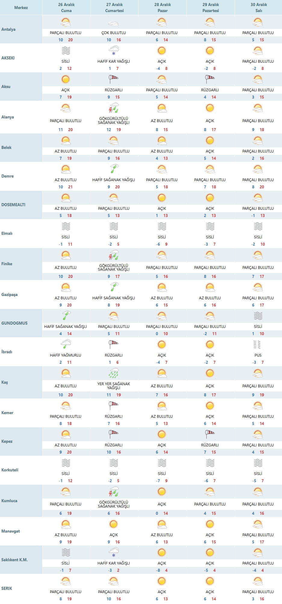26 Aralık Cuma günü Antalya’nın bazı ilçelerinde hafif yağış ihtimali de bulunuyor. Gündoğmuş ve Demre çevresinde hafif sağanak yağış beklenirken, Finike ve Gazipaşa’da gün genelinde az bulutlu bir hava hâkim olacak. İbradı’da ise hafif yağmurlu hava etkili olurken sıcaklık 11 dereceye kadar çıkıyor. Yağışların genel olarak kısa süreli ve yerel olması öngörülüyor. Bu nedenle günlük yaşamı ciddi şekilde etkilemesi beklenmiyor, ancak açık alanda plan yapanların tedbirli olması faydalı olabilir.