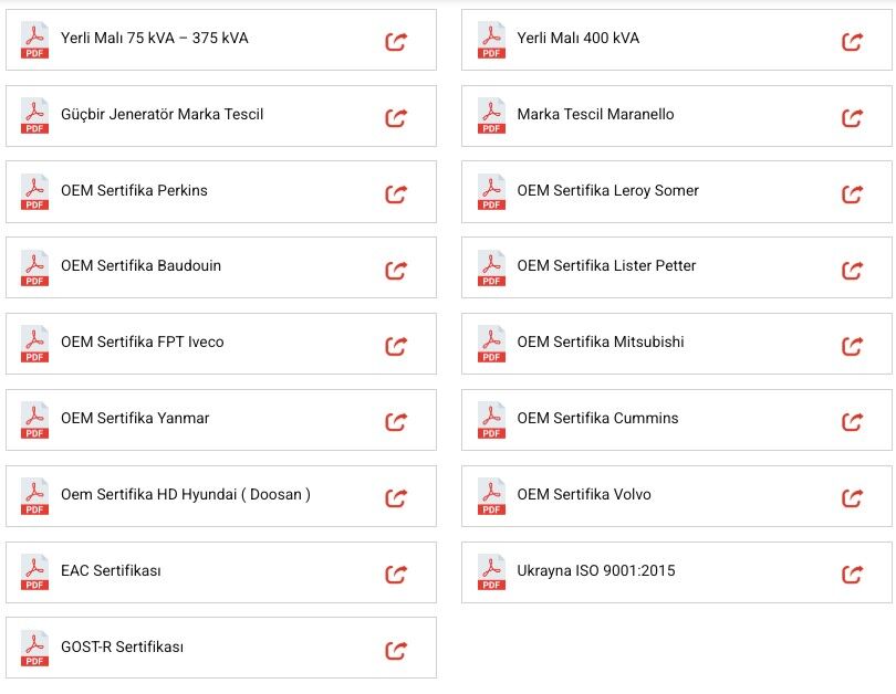 Güçbir Jeneratör, sahip olduğu 37 farklı kalite ve sistem sertifikasıyla Türkiye’nin ve dünyanın önde gelen enerji çözümü sağlayıcıları arasında yer alarak kesintisiz güç ihtiyacını en yüksek standartlarda karşılamaktadır. Endüstriyel tesislerden konut projelerine kadar geniş bir yelpazede hizmet sunan firma, üretim süreçlerinde uluslararası normları temel alarak kullanıcılarına güvenilir, uzun ömürlü ve yüksek performanslı jeneratör grupları sunar. Modern teknolojiyle donatılmış üretim hattı ve mühendislik tecrübesi, markayı jeneratör sektöründe bir adım öne çıkarırken, sahip olduğu geniş belge portföyü sunduğu kalitenin tescilli bir kanıtı niteliğindedir.