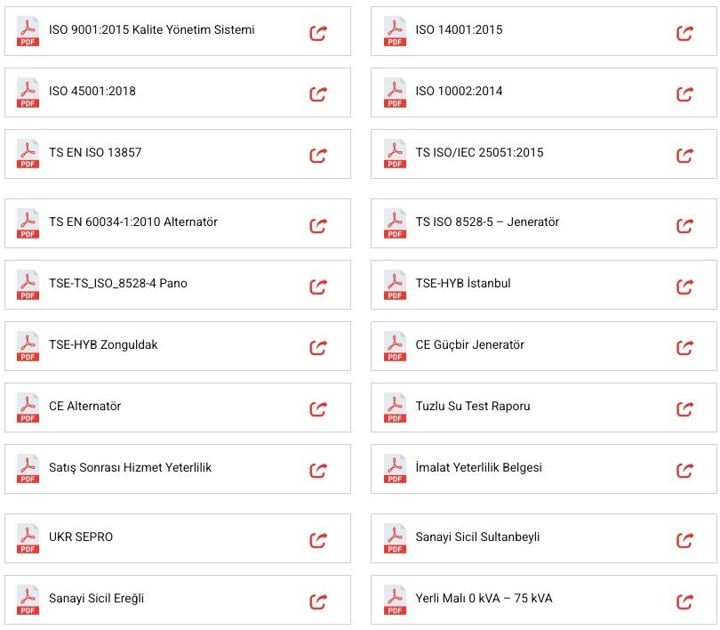Güçbir Jeneratör’ün Sahip Olduğu Sertifikalar