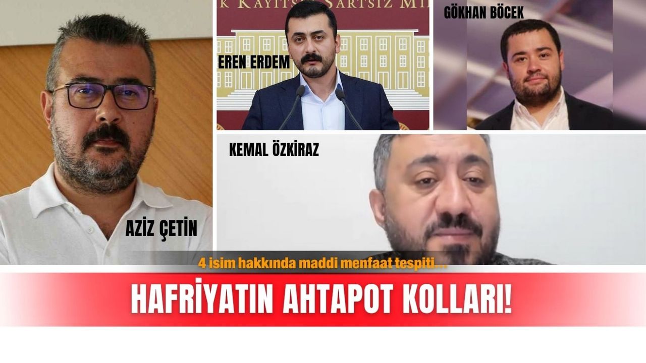 İçişleri Bakanlığı Mülkiye Teftiş Kurulu raporu, bilirkişi incelemeleri, MASAK verileri ve HTS kayıtları doğrultusunda hazırlanan dosyada; CHP eski Milletvekili Eren Erdem, araştırmacı Kemal Özkiraz, Antalyaspor’un eski başkanı Aziz Çetin ve Antalya Büyükşehir Belediye Başkanı Muhittin Böcek’in oğlu Mustafa Gökhan Böcek’in maddi menfaat sağladıkları tespit edildi.
