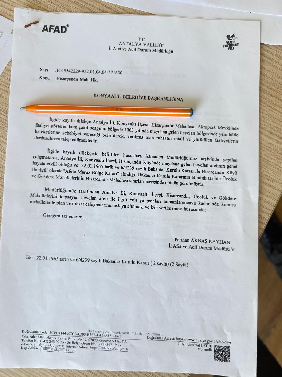 Bölge halkı, yaşanan mağduriyetin ardından Konyaaltı Belediyesi’ne sundukları dilekçeyle acı gerçeği bir kez daha hatırlattı. İl Afet ve Acil Durum Müdürlüğü (AFAD) tarafından hazırlanan raporlar, bölgenin aslında 61 yıl önce tescilli bir afet bölgesi olduğunu kanıtlıyor. Bakanlar Kurulu Kararı; 22 Ocak 1965 tarihli kararla bölge ‘Afete Maruz Bölge’ ilan edilmiş. İhmal iddiası; 1963’teki heyelana rağmen bölgede kum ve çakıl ocaklarına ruhsat verildiği, bu faaliyetlerin yeni kütle hareketlerini tetiklediği belirtiliyor. Faaliyetlerin durdurulması talebi; AFAD İl Müdür Vekili Perihan Akbaş Kayhan imzalı yazıda, bölgedeki tüm plan ve ruhsat çalışmalarının ivedilikle askıya alınması gerektiği vurgulandı.