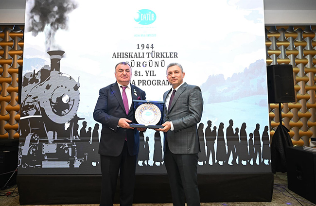 Açılış konuşmalarının ardından Dünya Ahıska Türkleri Birliği Genel Başkanı Ziyatdin Kassanov tarafından Vali Hulusi Şahin’e plaket takdim edildi ve Ahıska Türklerinin geleneksel giysisi olan Çapan giydirildi.