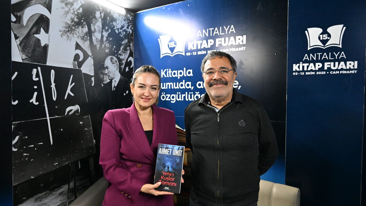 Antalya Büyükşehir Belediyesi’nin ev sahipliğinde “Kitapla umuda, adalete, özgürlüğe…” temasıyla düzenlenen 15. Antalya Kitap Fuarı, Cam Piramit’te binlerce ziyaretçiyi ağırlamaya devam ediyor. Türkiye’nin dört bir yanından 260 yazar ve 220 yayınevinin yer aldığı fuarda usta yazar Ahmet Ümit okurlarıyla buluştu. Antalyalıların yoğun ilgi gösterdiği imza gününde Ahmet Ümit, okurları ile sohbet etti. Ahmet Ümit, Antalya Büyükşehir Belediye Başkan Vekili Büşra Özdemir’e de “Yırtıcı Kuşlar Zamanı” isimli kitabını imzaladı. Ahmet Ümit’e fuara katılımı için teşekkür eden Özdemir, “Antalya’da üreten, yazan ve düşüncelerini okurlarla paylaşan yazarlarımızı stantlarında ziyaret ederek, eserlerinin arkasındaki emeği, birikimi ve edebiyata duydukları sevgiyi yakından hissettik. Kültürümüzü ve düşünce dünyamızı zenginleştiren tüm yazarlarımıza teşekkür ediyorum” dedi. Başkan Vekili Özdemir, yerel yazarlar standını da gezerek, yazarla ile sohbet etti.