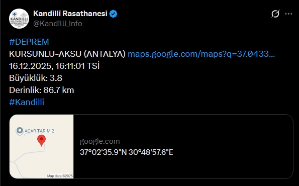 Antalya’nın Aksu ilçesine bağlı Kurşunlu bölgesinde saat 16:11’de 3.8 büyüklüğünde bir deprem meydana geldi. Kandilli Rasathanesi ve Deprem Araştırma Enstitüsü verilerine göre sarsıntı, yerin yaklaşık 86.7 kilometre derinliğinde kaydedildi. Herhangi bir can veya mal kaybı bildirilmedi.