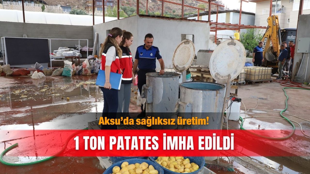 Antalya'nın Aksu ilçesinde bir ihbar üzerine harekete geçen belediye zabıta müdürlüğü ekipleri, Aksu İlçe Tarım ve Orman Müdürlüğü ekipleriyle birlikte Yurtpınar Mahallesi'nde patates dilimlemesi yapan bir işletmeye denetim gerçekleştirdi. Denetimde, uygunsuz ve sağlıksız şartlarda patates dilimlemesi yaptığı tespit edilen işletmeye ait yaklaşık 1 ton civarındaki soyulmuş ve doğranmış patatese el konularak imha edildi. Denetimde, üretimde kullanılan 2 adet endüstriyel patates soyma makinesi ile 1 adet patates dilimleme makinesine de el konularak işletmenin faaliyeti sonlandırıldı. İdari yaptırım cezası uygulanıp mühürlendi.