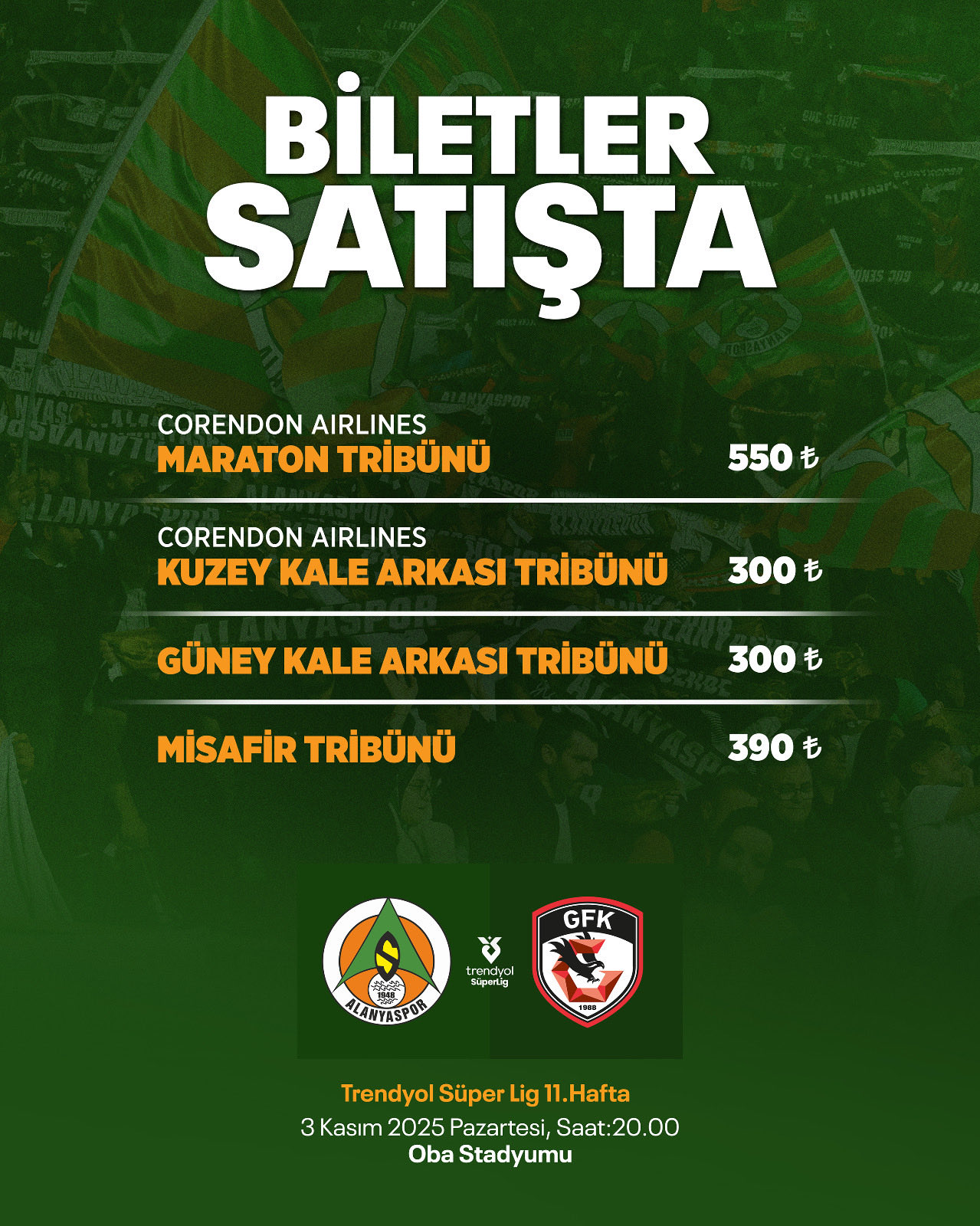 Trendyol Süper Lig’in 11’inci haftasında Alanyaspor, 3 Kasım Pazartesi günü saat 20.00’de Alanya GAİN Park Stadyumu’nda Gaziantep FK’yı konuk edecek. Zorlu karşılaşmada tribün desteğini arkasına almak isteyen turuncu-yeşilli kulüp, bilet satışlarını başlattı. Taraftarlar biletlerini Alanyaspor Kulübü Passolig Ofisi, www.passo.com.tr internet adresi ve Passo mobil uygulaması üzerinden temin edebilecek. Ayrıca, maç günü stadyum gişeleri de hizmet verecek. Karşılaşmayı yerinde izlemek isteyen taraftarların 7 yaş ve üzeri Passolig kartı ve e-bilet sahibi olmaları zorunlu tutulurken, 7 yaş altı çocuklar aileleri eşliğinde stadyuma giriş yapabilecek. Bilet fiyatları ise Maraton Tribünü için 550 TL, Kuzey ve Güney Kale Arkası tribünleri için 300 TL, Misafir Tribünü için ise 390 TL olarak açıklandı.