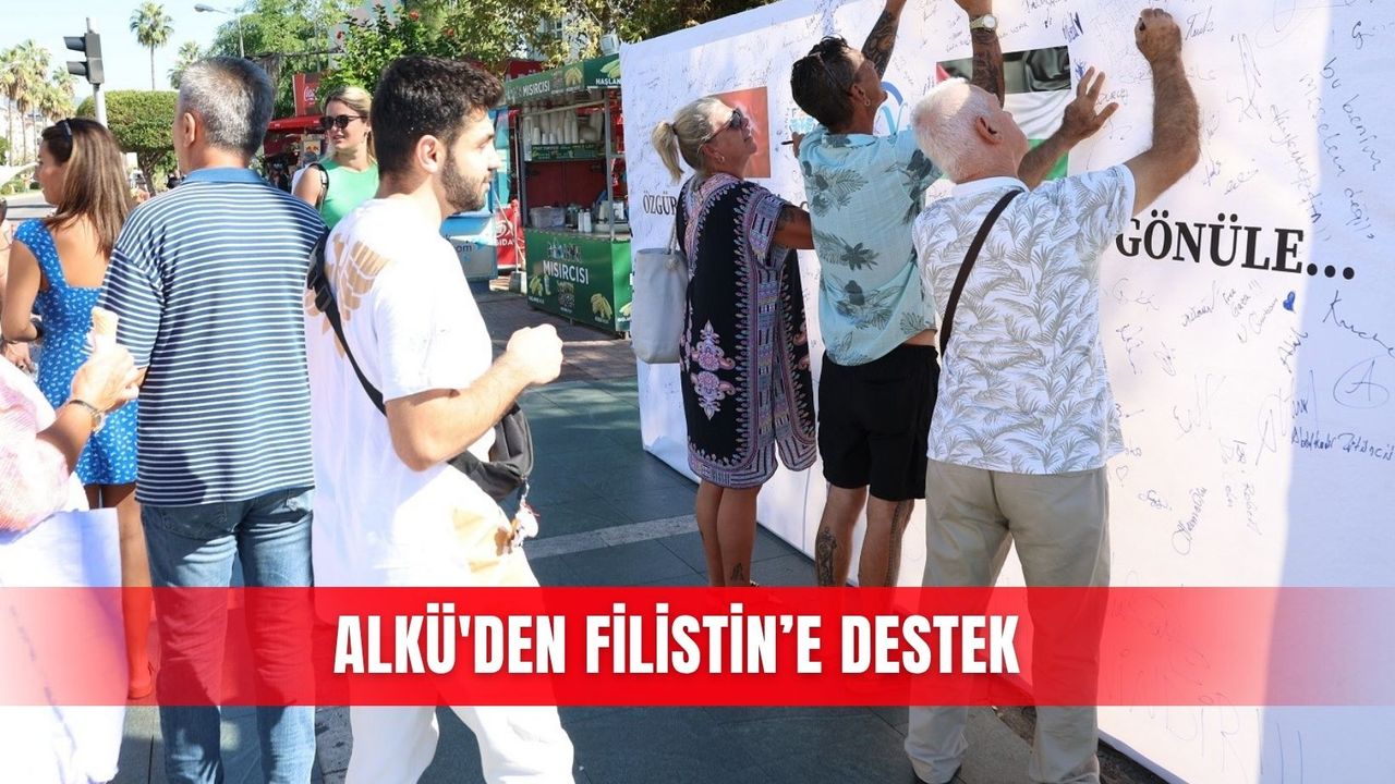 Alanya Alaaddin Keykubat Üniversitesi (ALKÜ) tarafından Anıt Meydanı’na konulan "Özgür Filistin, Özgür Gazze için Gönülden Gönüle" imza platformu, vatandaşlar ve turistler tarafından imzalarla dolduruldu.