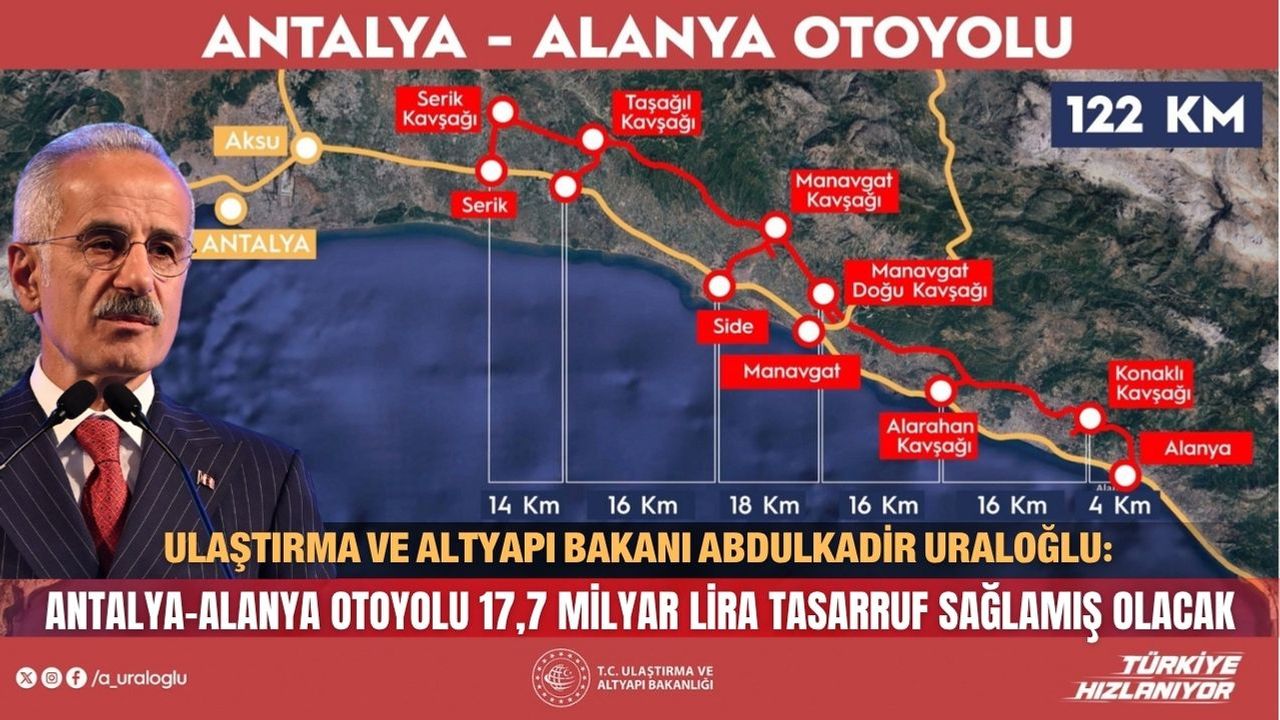 Otoyolun yolculuk süresini de kısaltacağını aktaran Uraloğlu, "Saatte 140 kilometre tasarım hızıyla mevcut yolda ortalama 2,5 saat, yoğun zamanlarda özellikle yaz aylarında 4 saate kadar varan bir ulaşım süresini 36 dakikaya güvenli ve istikrarlı bir şekilde indirmiş olacağız. Özellikle yaz aylarında yaşanan trafik çilesini de ortadan kaldırmış olacağız. Bölgedeki Kleopatra Plajı'ndan Kaleiçi'ne, Aspendos'tan Manavgat Şelalesi'ne uzanan yolculukları hızlı, güvenli ve konforlu bir hale getirmiş olacağız. Ayrıca projemiz zamandan 16,9 milyar lira, akaryakıttan 800 milyon lira olmak üzere yıllık yaklaşık 17,7 milyar lira tasarruf sağlamış olacak" şeklinde konuştu.