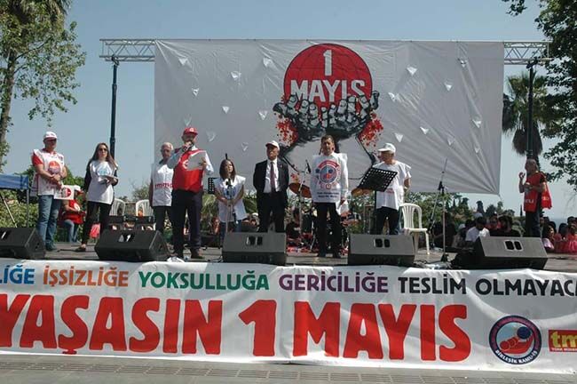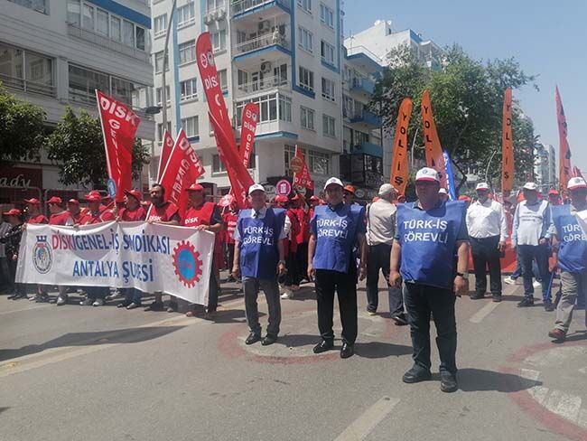 Birleşik Kamu Antalya İl Başkanı Sadık Acar ise konuşmasında tüm işçi emekçilerini selamlayarak, “Sömürenlerin saldırılarına boyun eğmeyen ve işçi sınıfının uluslararası mücadele günü olan 1 Mayıs’ta vatan, Cumhuriyet ve emek diyerek alanlara çıkan tüm işçi-emekçi kardeşlerimize selam olsun. Selam olsun birlik içinde bu mücadeleye omuz verenlere Selam olsun demiri oya gibi işleyen eli nasırlı onurlu işçilere.Selam olsun eğitim, sağlık ve hizmet üreten kamu emekçilerine. Yürünen sancılı yolda, doğan güne selam olsun. Yunus Emre’den Can Yücel’e yazan kaleme selam olsun. Pir Sultan’dan Mahsuni’ye çalan saza selam olsun. Mustafa Kemal’den Uğur Mumcu’ya yolumuzu aydınlatanlara selam olsun. Yüreklerde açan güle, zincirdeki bileklere, selam olsun yürekleri Devrim ateşi ile yanan, yandıkça tüm yurdu aydınlatan devrimci gençlere, tüm dünyanın ezilenlerine örnek, yaktı bir devrim ateşi, Mustafa Kemal’in mavi gözleri, aydınlık beyni.Uğruna ölenlere, yolunda yürüyenlere selam olsun. İnsan onuruna yaraşır bir hayat sürebilmemiz için; içinden çıkılmaz hale gelen hayat pahalılığına karşı enflasyon farklarının aylık olarak maaşlara yansıtılmasına.4688 sayılı kanunla yürütülen toplu sözleşme aldatmacasına karşı grevli toplu sözleşme hakkımız için. Yolsuzluğa, yoksulluğa ve yasaklara geçit vermemek, hesap sormak için. Yargının iktidar güdümünden kurtarılıp bağımsız olması için, emperyalizm ve işbirlikçilerinin ucuz iş gücü üretmek adı altında emekçilere zulüm ettikleri için. Ülkemizin komşu bölge ülkelerine karşı savaşa sürülmesine dur demek için. Mücadelemizi zafere ulaşıncaya kadar sürdüreceğimizi dost düşman herkese ilan ediyoruz. Yaşasın 1 Mayıs” ifadelerini kullandı.