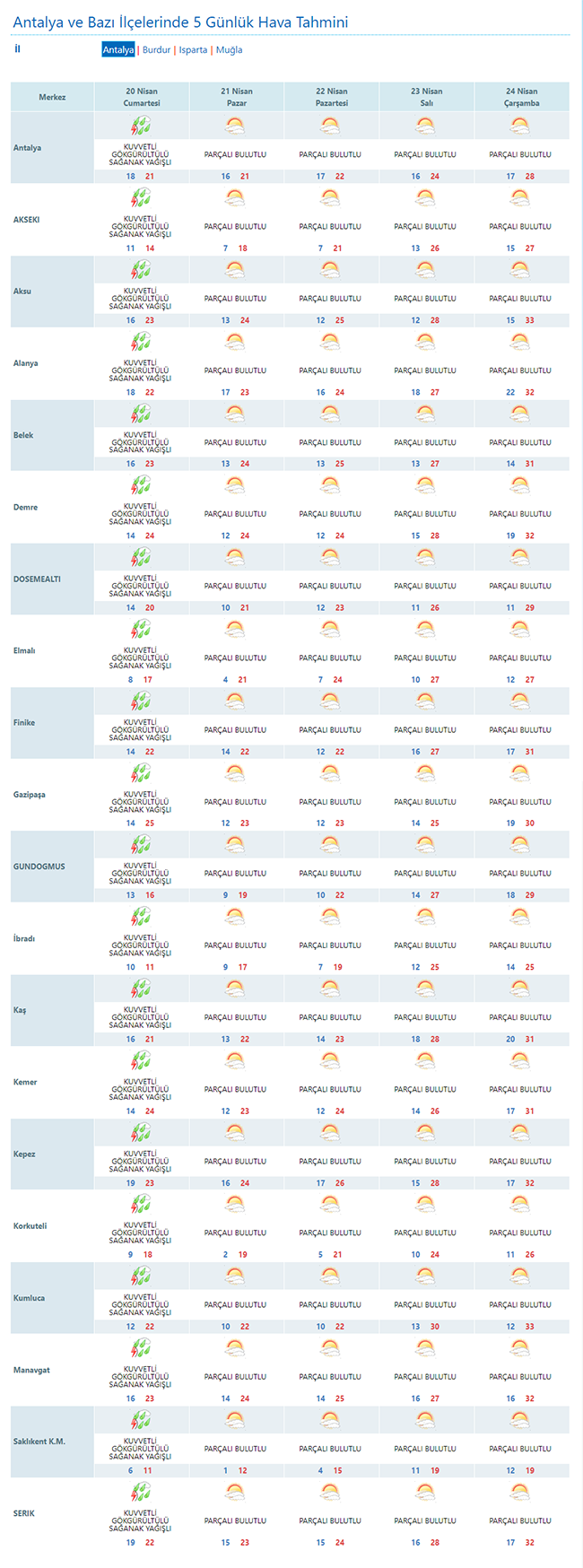 Antalya'da 20.04.2024 hava durumu Tahminleri: Meteoroloji 4. Bölge Müdürlüğü tarafından yapılan güncel açıklamaya göre, yarın Antaya'nın tüm ilçelerinde kuvvetli gökgürültülü sağanak yağış bekleniyor.
