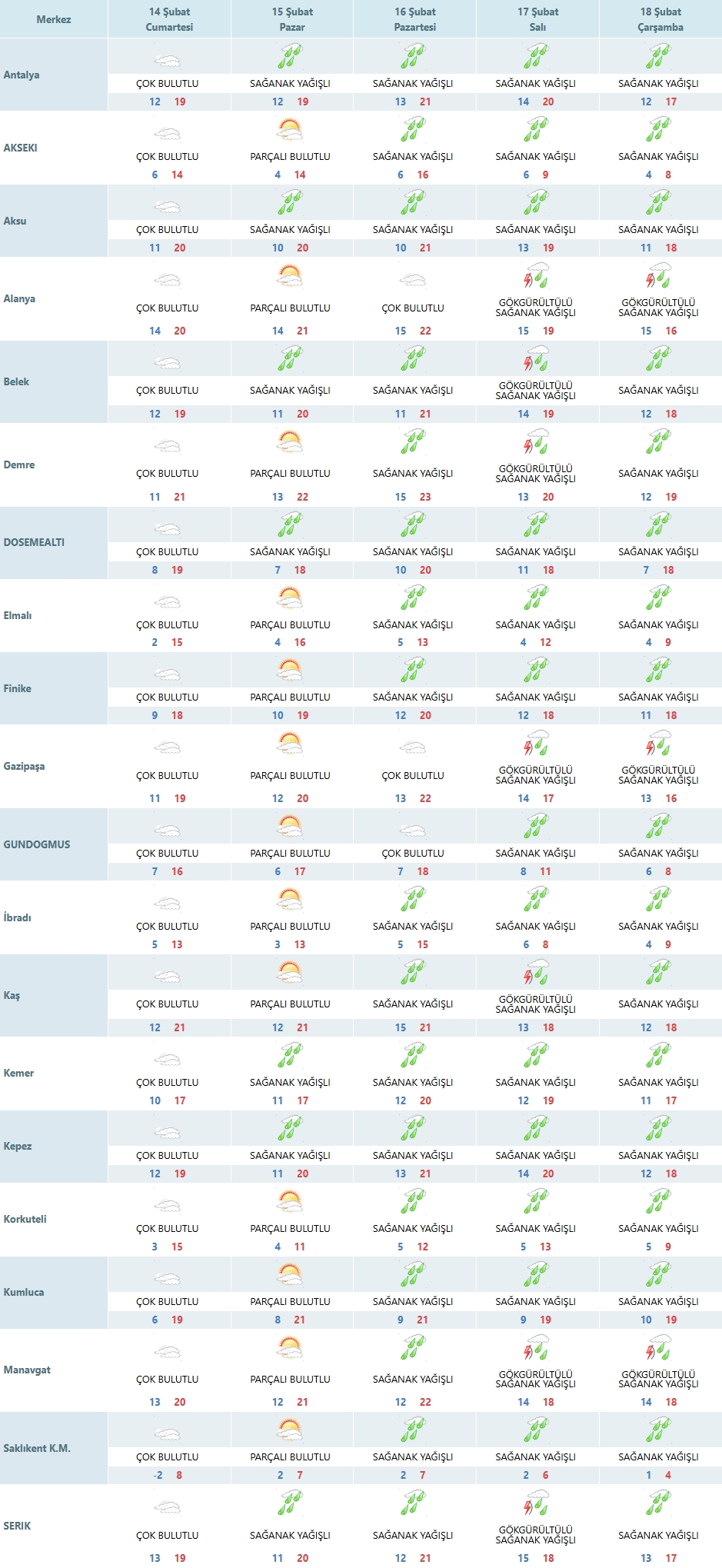 İlçeler: Alanya ve Manavgat gibi sahil noktalarında termometreler 20°C’yi görecek.