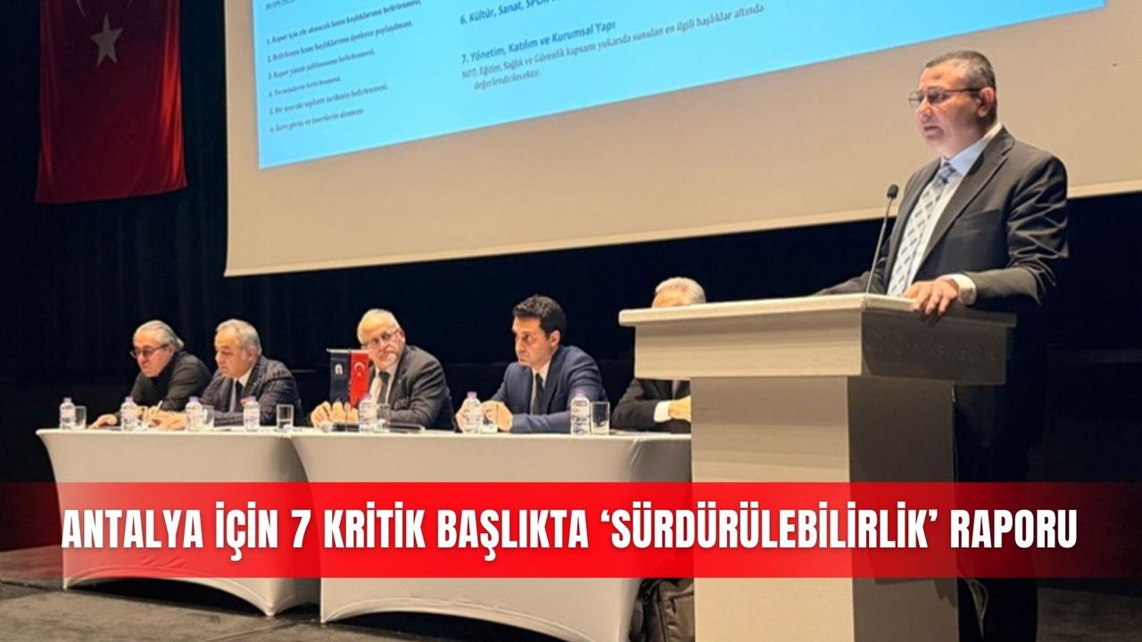 Antalya'nın hızlı nüfus artışı, yoğun turizm baskısı ve plansız kentleşme sürecinde karşı karşıya kaldığı yapısal sorunlara çözüm üretmek amacıyla; Antalya Dayanışma Grubundan İnşaat Mühendisi Akın Akıncı, Çevre Mühendisi Cem Arüv, Makine Mühendisi Prof. Dr. İbrahim Atmaca, İnşaat Mühendisi Mustafa Balcı, İnşaat Mühendisi Sarper Dermut, Harita Mühendisi Okan Hançer, Ekonomist Osman Sert ve Harita Mühendisi Ertuğrul Yılmazhan tarafından hazırlanan 'Antalya Sürdürülebilirlik Raporu', basın toplantısıyla kamuoyuna açıklandı.