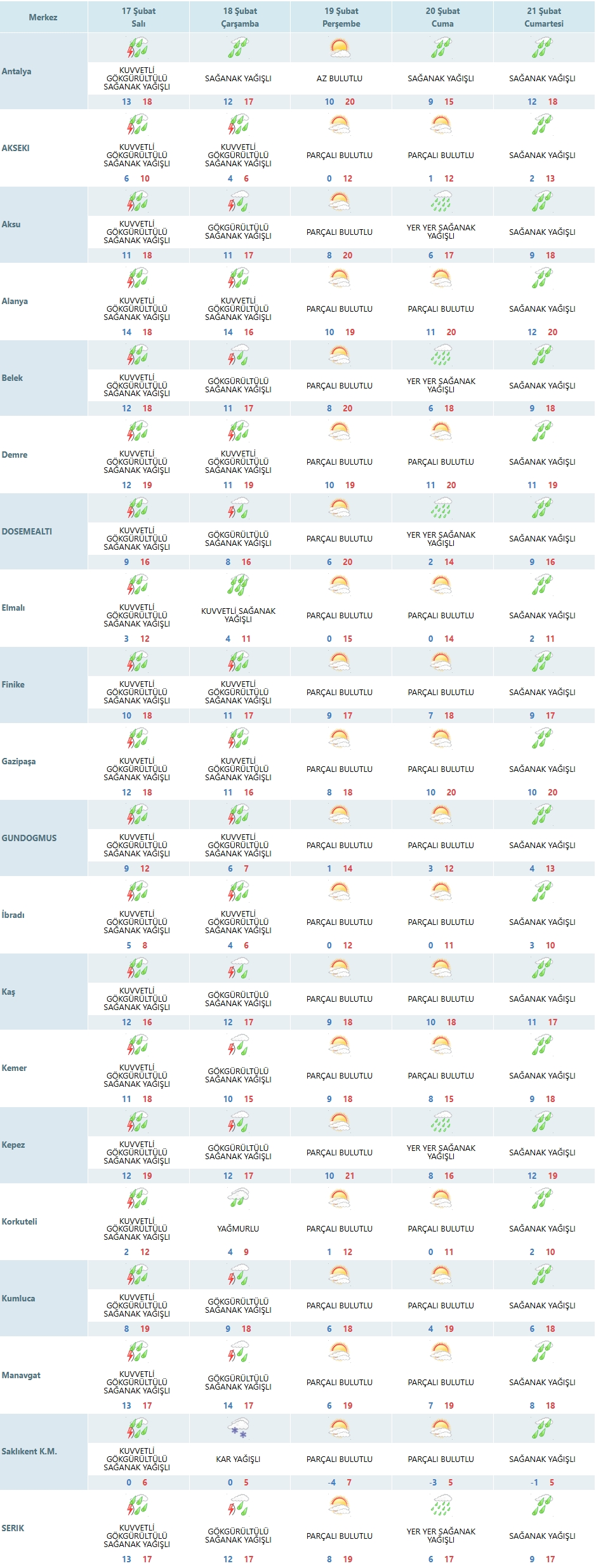 Batı ve İç Kesimler (Demre, Kaş, Elmalı): Batı sahil şeridinde gök gürültülü fırtına beklenirken, iç kesimlerde yağışlar sağanak şeklinde devam edecek.