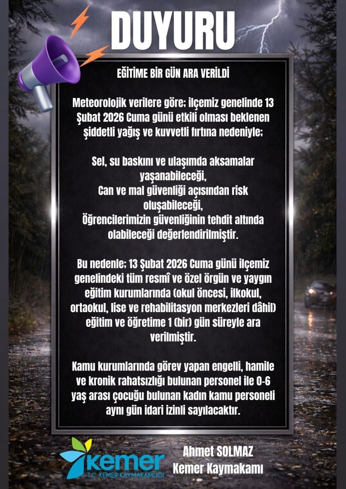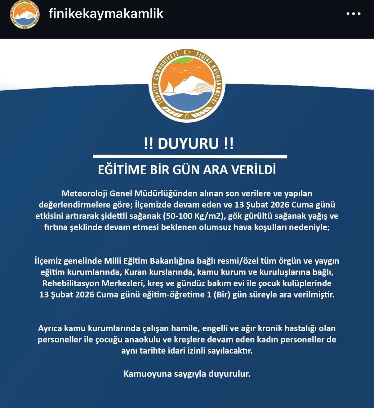 13 Şubat 2026 Cuma günü eğitim-öğretime 1 (bir) gün süreyle ara verildi.