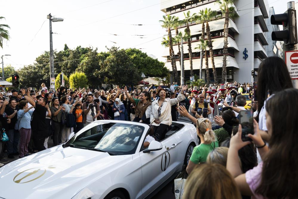 Üstü açık klasik otomobillerle halkı selamlayan ünlü isimlere, samba dansçıları, Yeşilçam maskotları ve bando takımları eşlik etti. Antalya Büyükşehir Belediye Başkan Vekili Büşra Dirgen Özdemir de Serap Aksoy ile birlikte klasik otomobilden vatandaşları selamlayarak çiçek dağıttı.