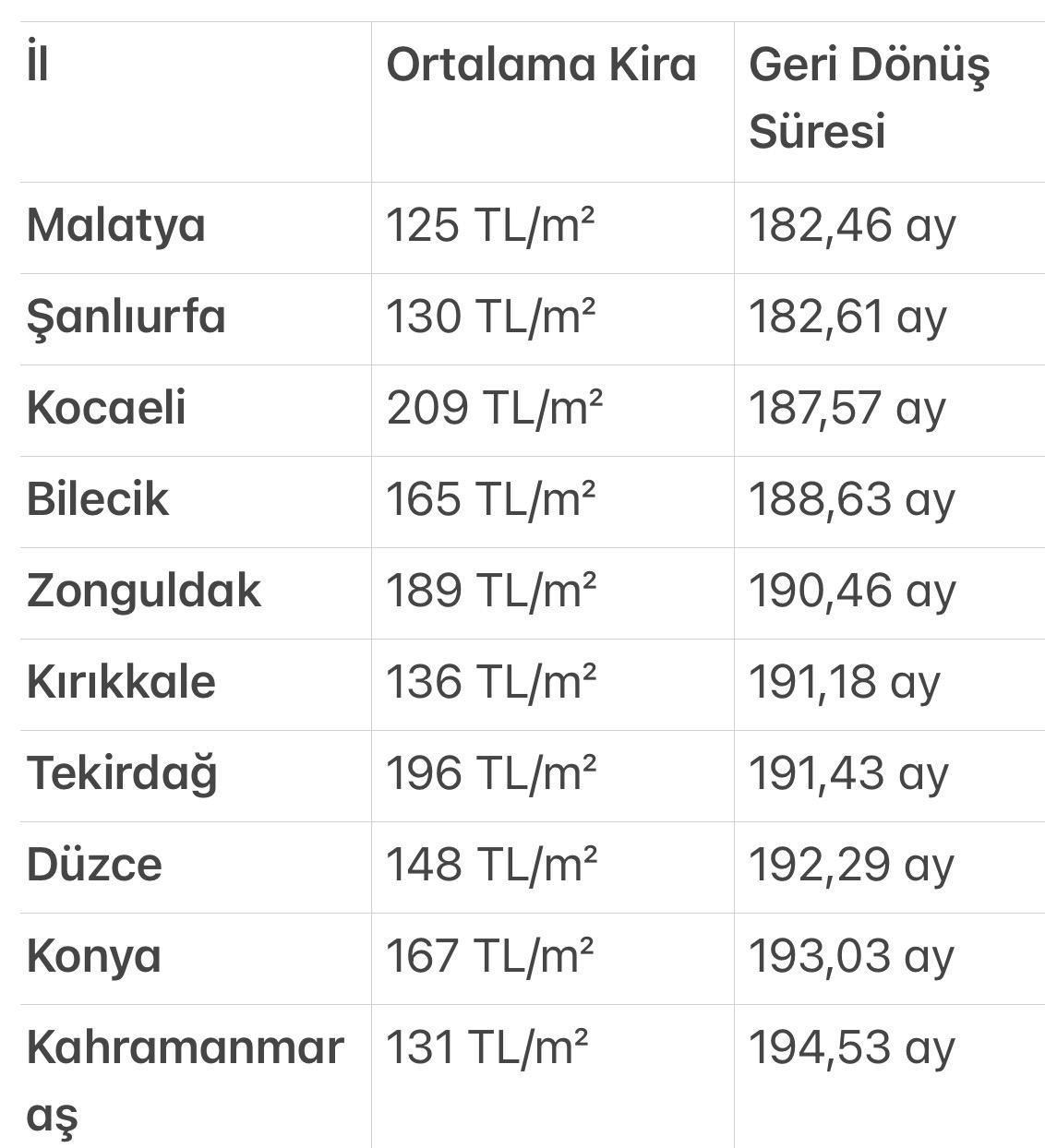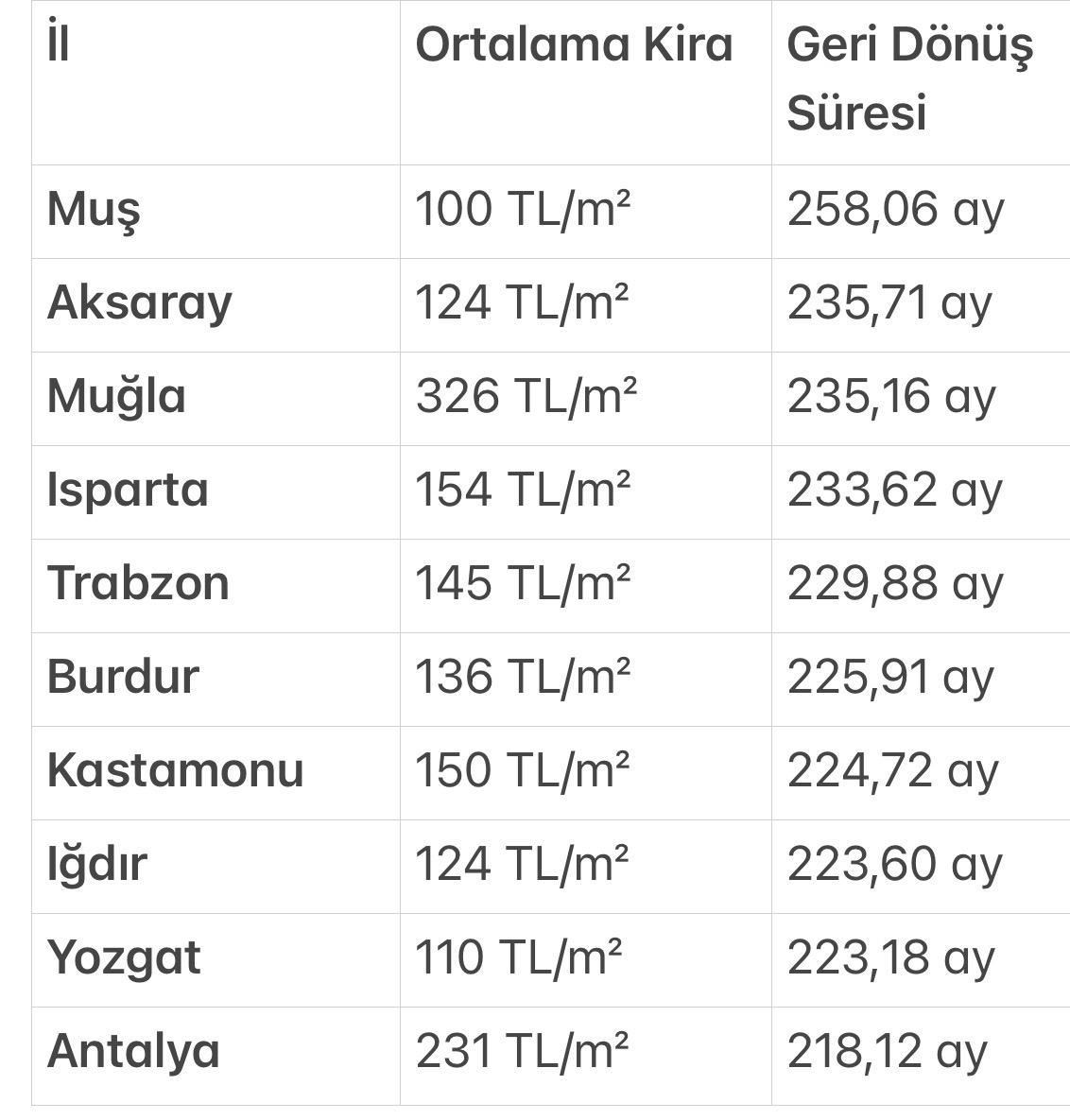 Antalya özelinde ise tablo farklılaşıyor. Kentte ortalama kira 231 TL/metrekare ile Türkiye ortalamasının üzerinde bulunuyor. Ancak satış fiyatlarının da yüksek seyretmesi nedeniyle geri dönüş süresi 218,12 aya kadar çıkıyor. Bu rakam, Antalya’yı “kira getirisi görece düşük” iller arasında üst sıralara taşıyor.