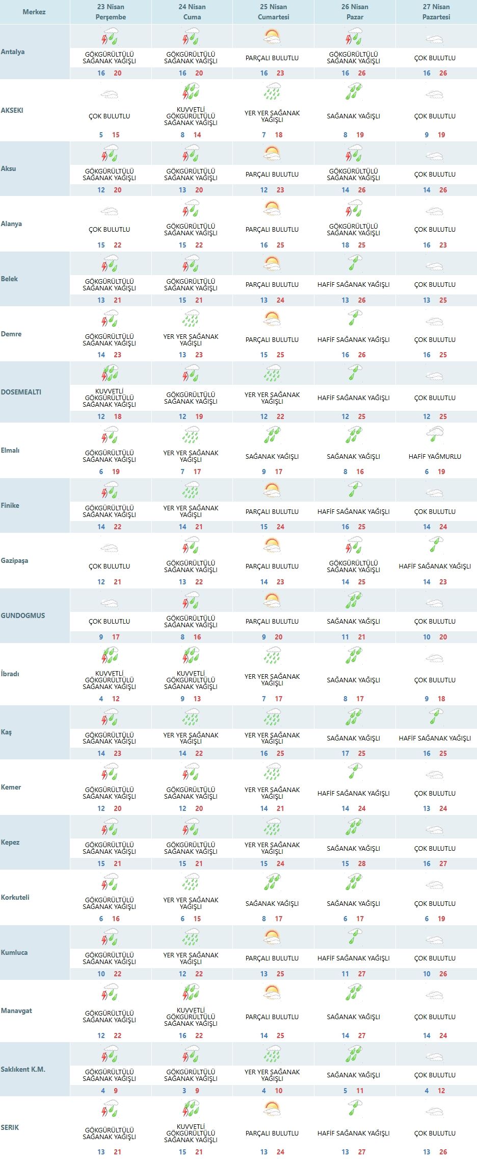 Akseki, Alanya ve Gündoğmuş’ta ise çok bulutlu hava öne çıkarken, yağışın yer yer etkili olabileceği değerlendiriliyor. Demre’de de gök gürültülü sağanak yağış dikkat çekiyor. Bu tablo, Antalya genelinde yağışın yaygın ve etkili olacağını ortaya koyuyor.