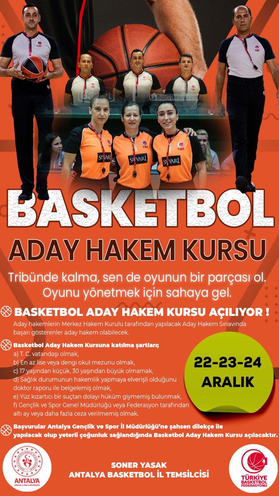 Türkiye Basketbol Federasyonu Antalya Gençlik ve Spor İl Müdürlüğü ile Antalya Basketbol İl Temsilciliği, kentte artan maç trafiğine çözüm üretmek amacıyla 22-23-24 Aralık tarihlerinde Basketbol Aday Hakem Kursu düzenliyor. Antalya Basketbol İl Temsilcisi Soner Yasak, bu sezon liglerdeki karşılaşmaların her geçen gün arttığını belirterek, “Maç yoğunluğumuz büyürken hakem sayımız aynı oranda artmadı. Bu nedenle yeni bir kurs açma kararı aldık. Hedefimiz Türk basketboluna daha fazla hakem kazandırmak. Bu işe gönül veren, önemseyen ve sorumluluk bilinciyle davranan herkes mutlaka iyi noktalara gelecektir” ifadelerini kullandı. Yasak, süreç boyunca destek veren TBF Başkanı Hidayet Türkoğlu, Antalya Valisi Hulusi Şahin ve İl Müdürü Yavuz Gürhan’a teşekkür etti.