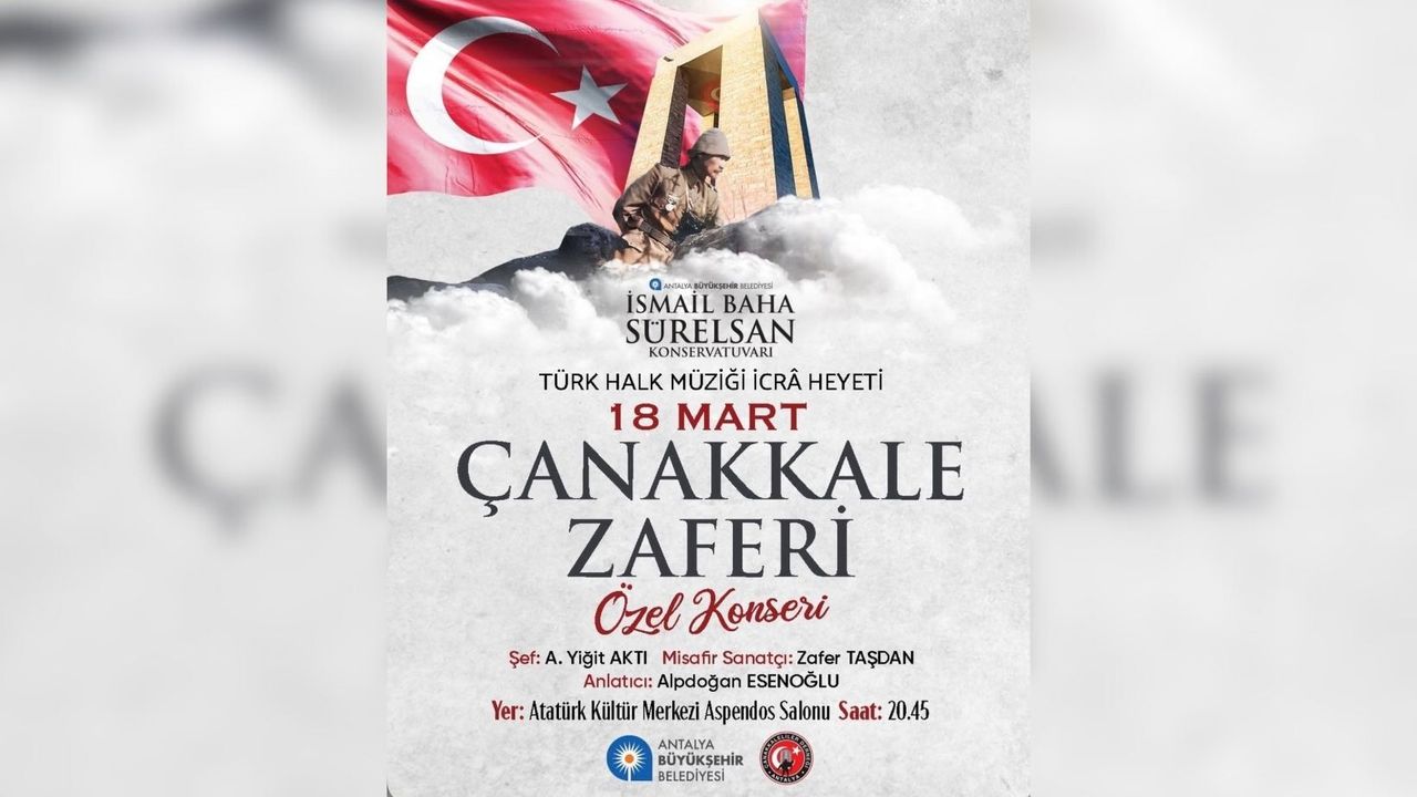 Şef Yiğit Aktı yönetimindeki Büyükşehir Belediyesi İsmail Baha Sürelsan Konservatuvarı Türk Halk Müziği İcrâ Heyeti tarafından hazırlanan konserde, Çanakkale Zaferi'nin anlam ve önemine ithafen türküler ve anlatılar seslendirilecek. Alpdoğan Esenoğlu'nun anlatıcılığını yapacağı programda, TRT İstanbul Radyosu sanatçısı Zafer Taşdan konuk sanatçı olarak yer alacak. 18 Mart Çanakkale Zaferi Özel Konseri, 18 Mart Çarşamba günü saat 20.45'te Atatürk Kültür Merkezi Aspendos Salonu'nda gerçekleştirilecek. Program halka açık ve ücretsiz.