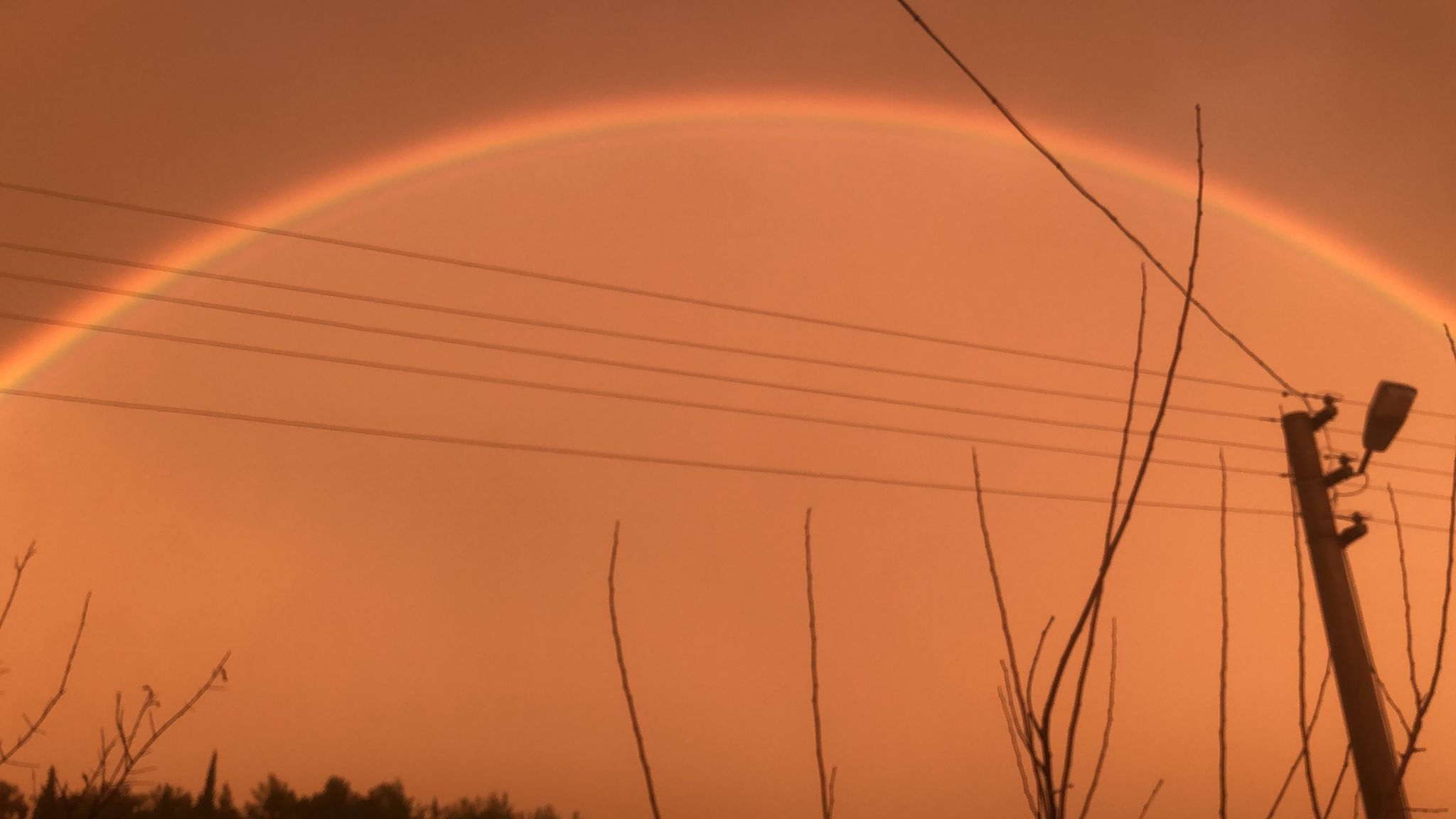 Serik Yeşilyurt Mahallesi'nde gökyüzünde iki gökkuşağını aynı anda gören çiftçi, büyük heyecan yaşadı. O anları cep telefonuyla kaydeden çiftçinin heyecanlı anlatım tarzı tebessüm ettirdi. Yağan yağmur sonrası, çifte gökkuşağını görüntüleyen çiftçi, "Görüyorsunuz anlatmaya gerek yok. Güzel bir duygu. Serik'te semalarda çift gökkuşağı. İnanılmaz anlar. Harika bir his. Bir bakın Allah ve Muhammed aşkına bir bakın. Harika, gökkuşağı tam oluştu arkadaşlar" ifadelerini kullandı.