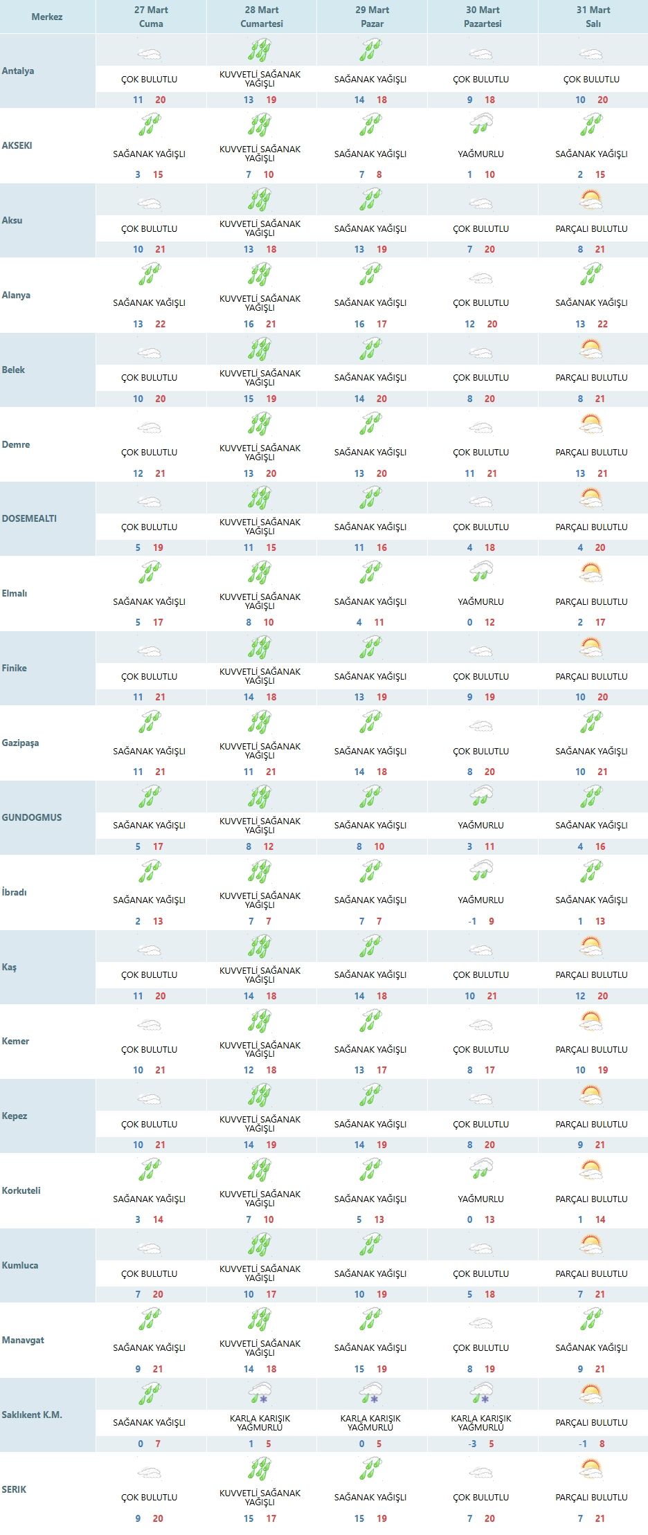 Antalya il genelinde 27 Mart Cuma günü parçalı ve çok bulutlu bir hava hakim olurken, birçok ilçede sağanak yağışın etkili olması bekleniyor. Şehir merkezinde hava sıcaklığı en düşük 11, en yüksek 20 derece civarında seyredecek ve gökyüzü gün boyu çok bulutlu kalacak.