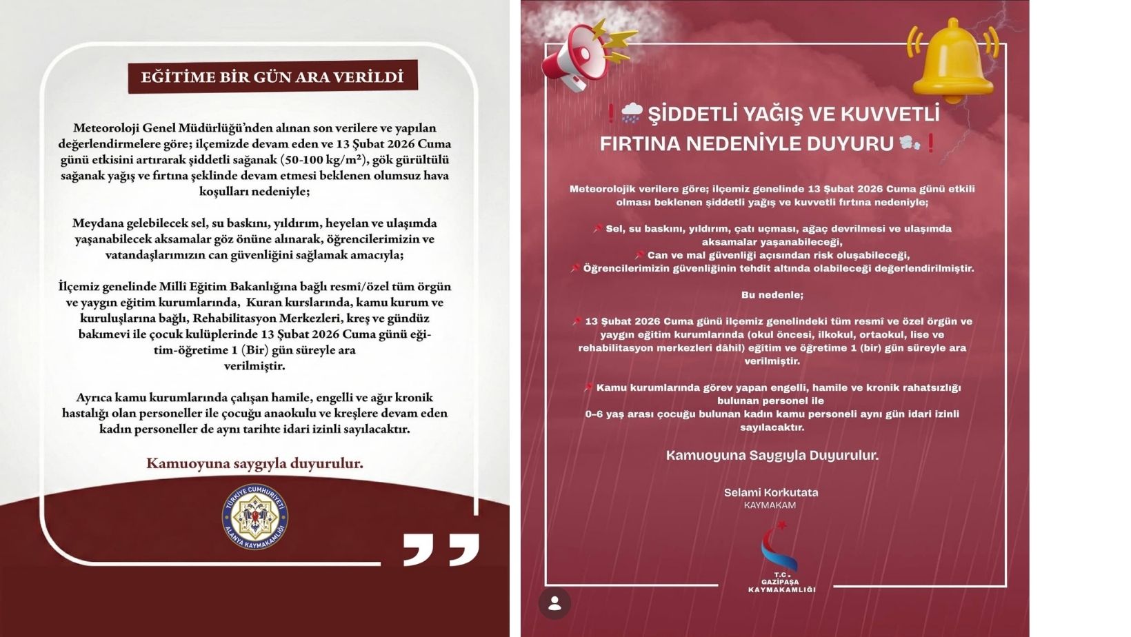 13 Şubat 2026 Cuma günü eğitim-öğretime 1 (bir) gün süreyle ara verildi.