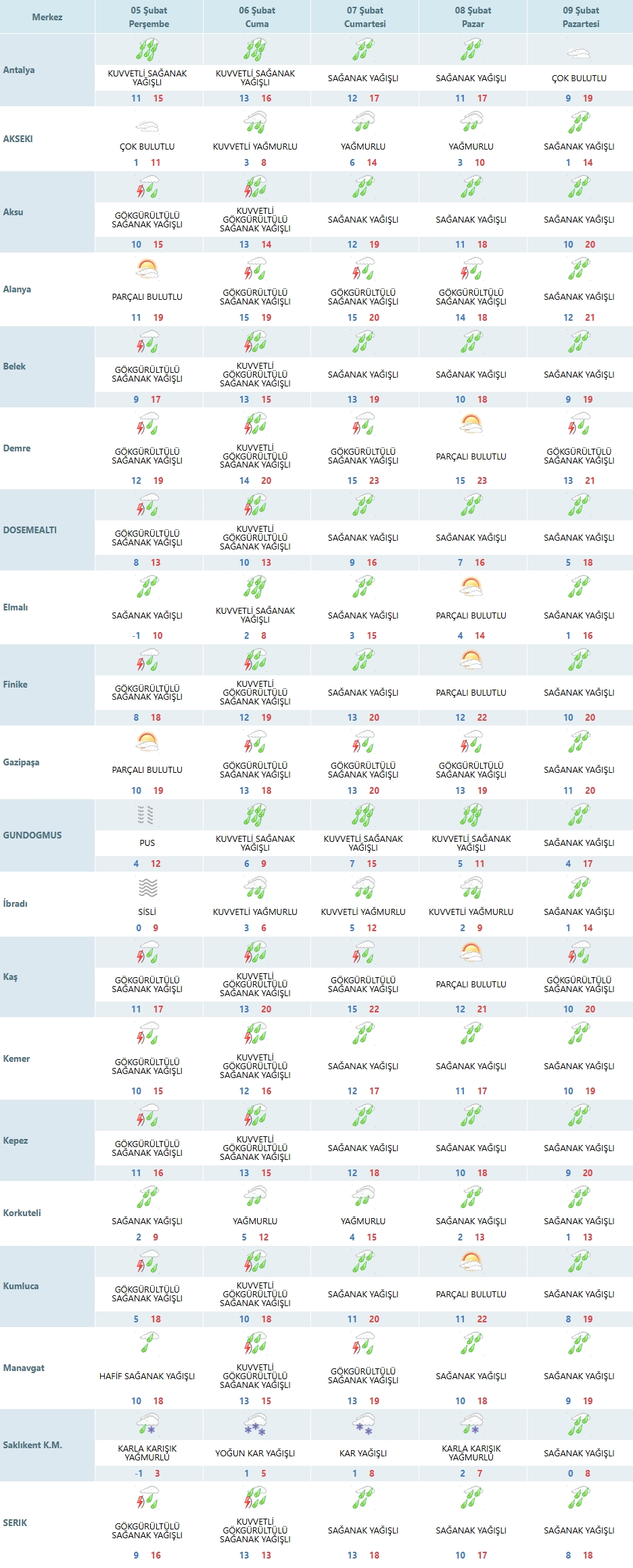 Antalya şehir merkezinde (Muratpaşa, Konyaaltı hattı) Perşembe günü kuvvetli sağanak yağış bekleniyor.
