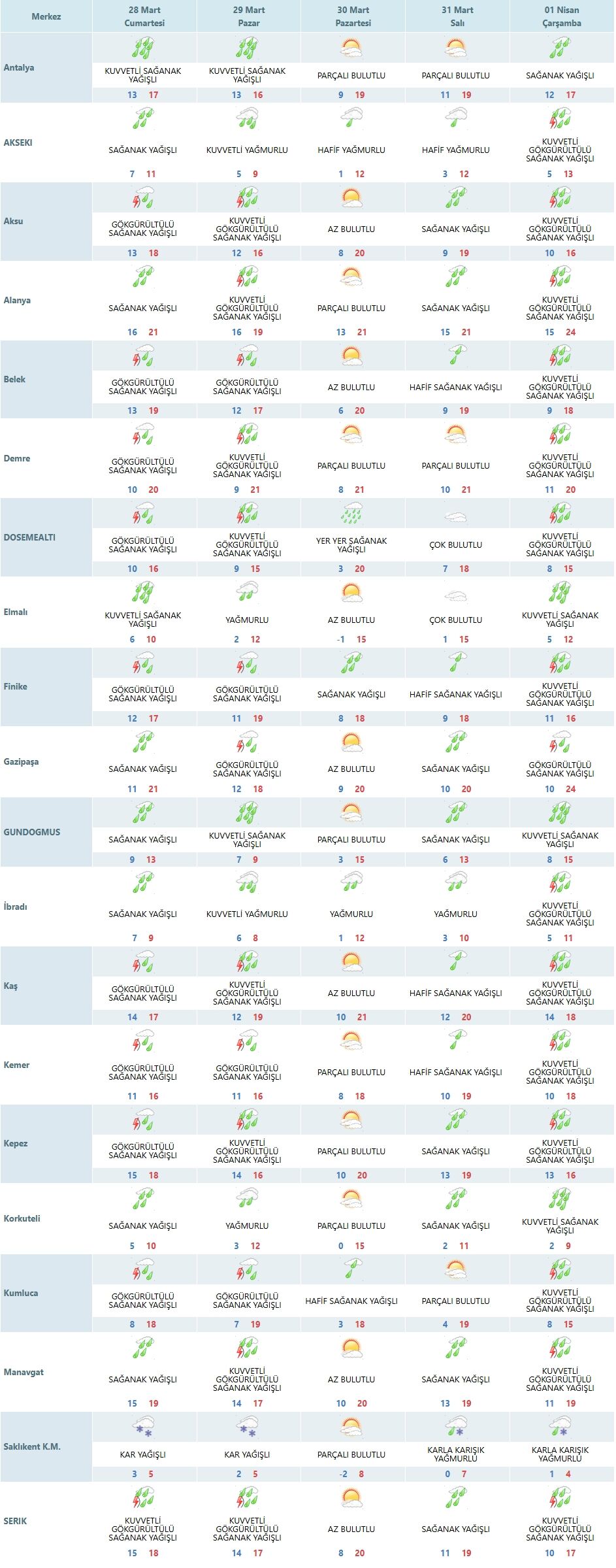 Hafta sonunun ilk günü olan 28 Mart Cumartesi, Antalya genelinde oldukça hareketli bir hava bekleniyor. Şehir merkezinde hava sıcaklığı 13 ile 17 derece arasında seyrederken, gün boyu kuvvetli sağanak yağış etkisini gösterecek. Özellikle Aksu, Belek, Demre, Döşemealtı, Finike, Kaş, Kemer, Kepez, Kumluca ve Serik hattında sağanak yağışın gök gürültüsüyle birlikte kuvvetli olması öngörülüyor. Alanya, Gazipaşa ve Manavgat gibi doğu ilçelerinde ise sıcaklıklar 21 dereceye kadar çıksa da sağanak yağış bu bölgeleri de etkisi altına alacak. İç kesimlerde Akseki 11, Korkuteli 10 ve Elmalı 10 derece civarında seyrederken, Saklıkent Kayak Merkezi'nde kar yağışı bekleniyor.