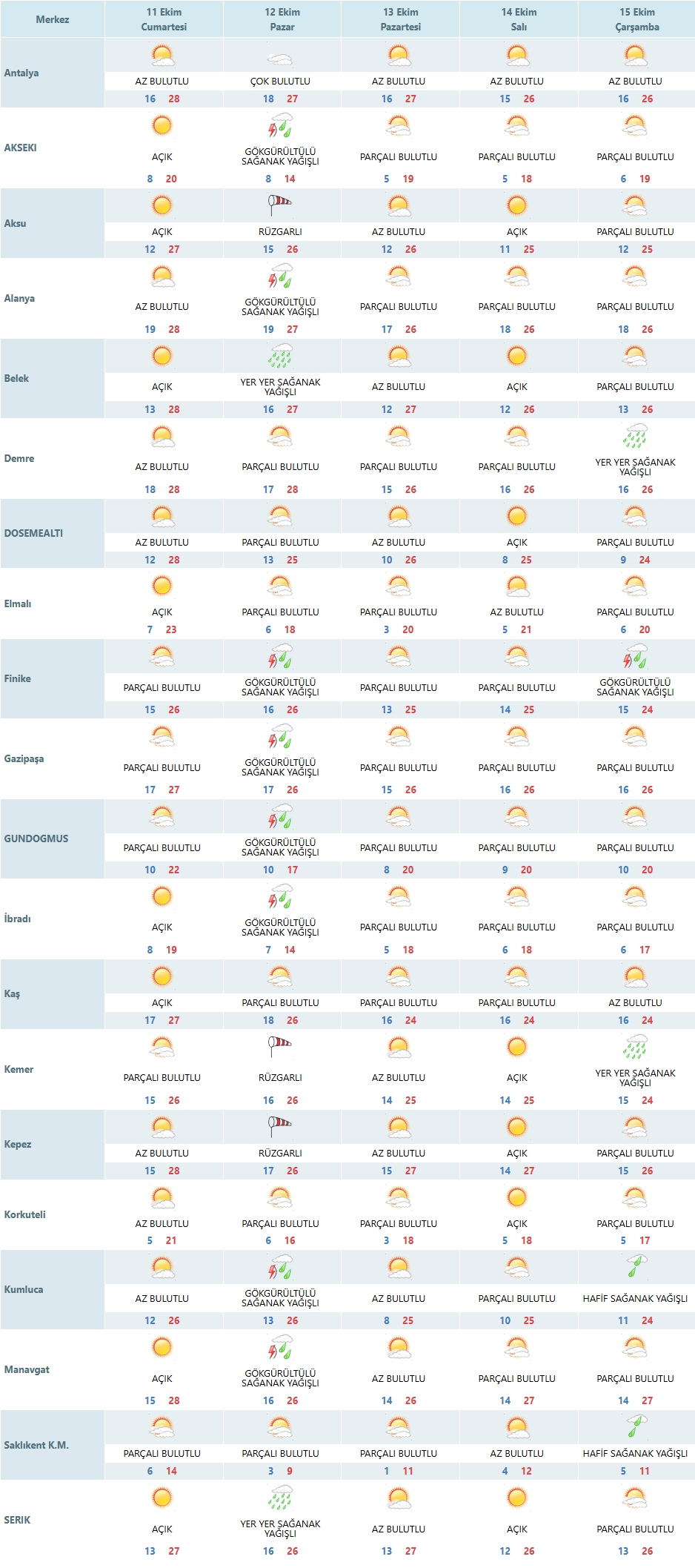 12 Ekim Pazar günü ise tablo değişiyor. Meteoroloji raporlarına göre Antalya genelinde çok bulutlu ve gök gürültülü sağanak yağışlı bir hava bekleniyor. Özellikle Akseki, Finike, Gazipaşa, Gündoğmuş, Kumluca ve Manavgat çevrelerinde yer yer kuvvetli yağışlar görülebilir. Kent merkezinde hava 18 dereceye kadar düşecek, en yüksek sıcaklık ise 27 derece olacak. Rüzgârın yer yer etkili esmesiyle birlikte ani sağanak geçişleri yaşanabilir.