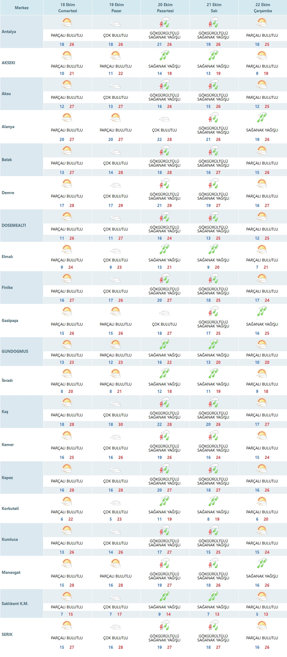 • Kaş ve Demre’de ise pazar günü bulut oranı artacak ancak yağış beklenmiyor.