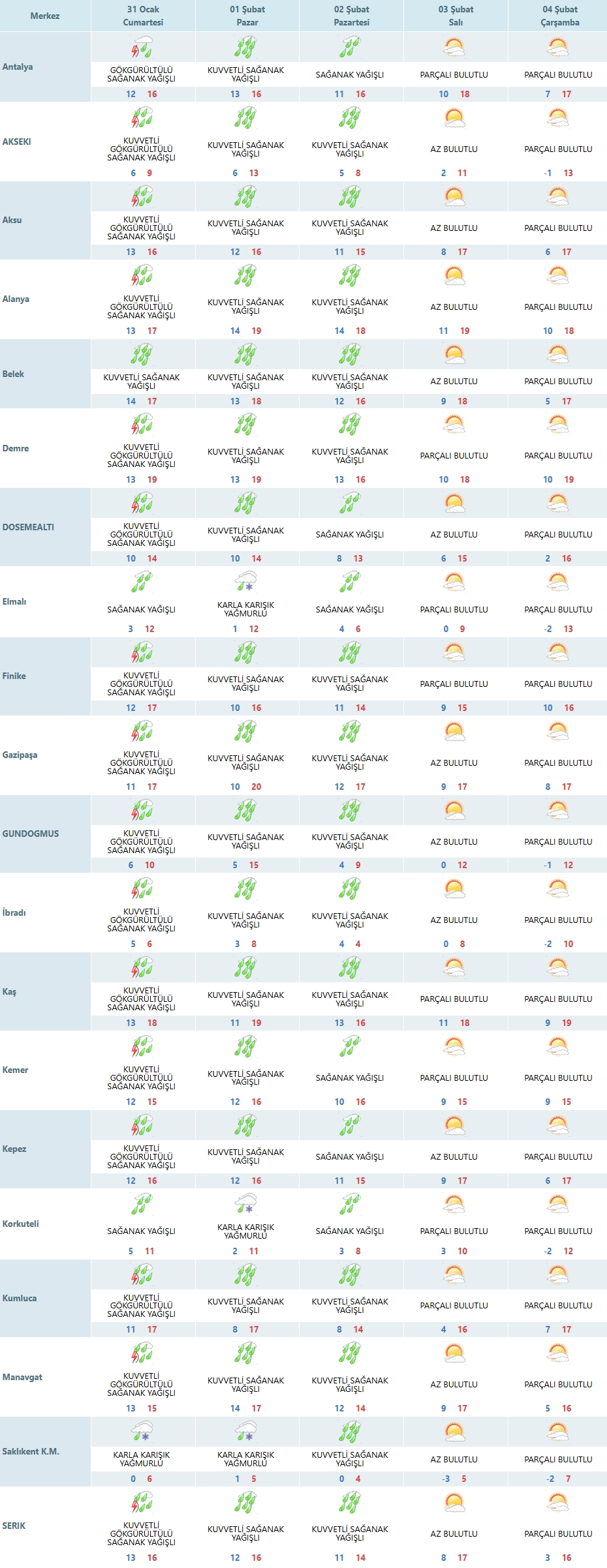 İç Kesimlerde Karla Karışık Yağmur: Elmalı, Korkuteli ve Saklıkent K.M. bölgelerinde Pazar günü Karla Karışık Yağmurlu bir hava görülecek. Özellikle Korkuteli 2°C, Saklıkent ise 1°C’ye kadar düşen sıcaklıklarla üşütecek.