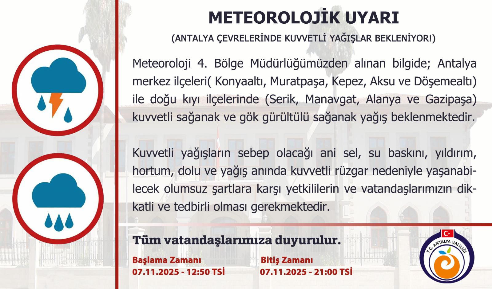Meteoroloji 4. Bölge Müdürlüğü, Antalya ve çevresi için kuvvetli yağış uyarısında bulundu. Yapılan açıklamaya göre bugün saat 12.50 ile 21.00 arasında Antalya merkez ilçeleri (Konyaaltı, Muratpaşa, Kepez, Aksu ve Döşemealtı) ile doğu kıyı ilçelerinde (Serik, Manavgat, Alanya ve Gazipaşa) yer yer kuvvetli sağanak ve gök gürültülü sağanak yağış bekleniyor. Yetkililer, yağışlarla birlikte ani sel, su baskını, yıldırım, hortum, dolu ve yağış anında kuvvetli rüzgâr gibi olumsuzluklara karşı vatandaşları dikkatli ve tedbirli olmaya çağırdı. Meteoroloji uzmanları, özellikle kıyı kesimlerde yaşayan vatandaşların su taşkınlarına karşı önlem almasını, trafikte ise sürücülerin dikkatli olmasını tavsiye etti. Yetkililer, gelişmelerin takip edilmesi ve olası risklere karşı gerekli tedbirlerin alınması konusunda uyarılarını yineledi.