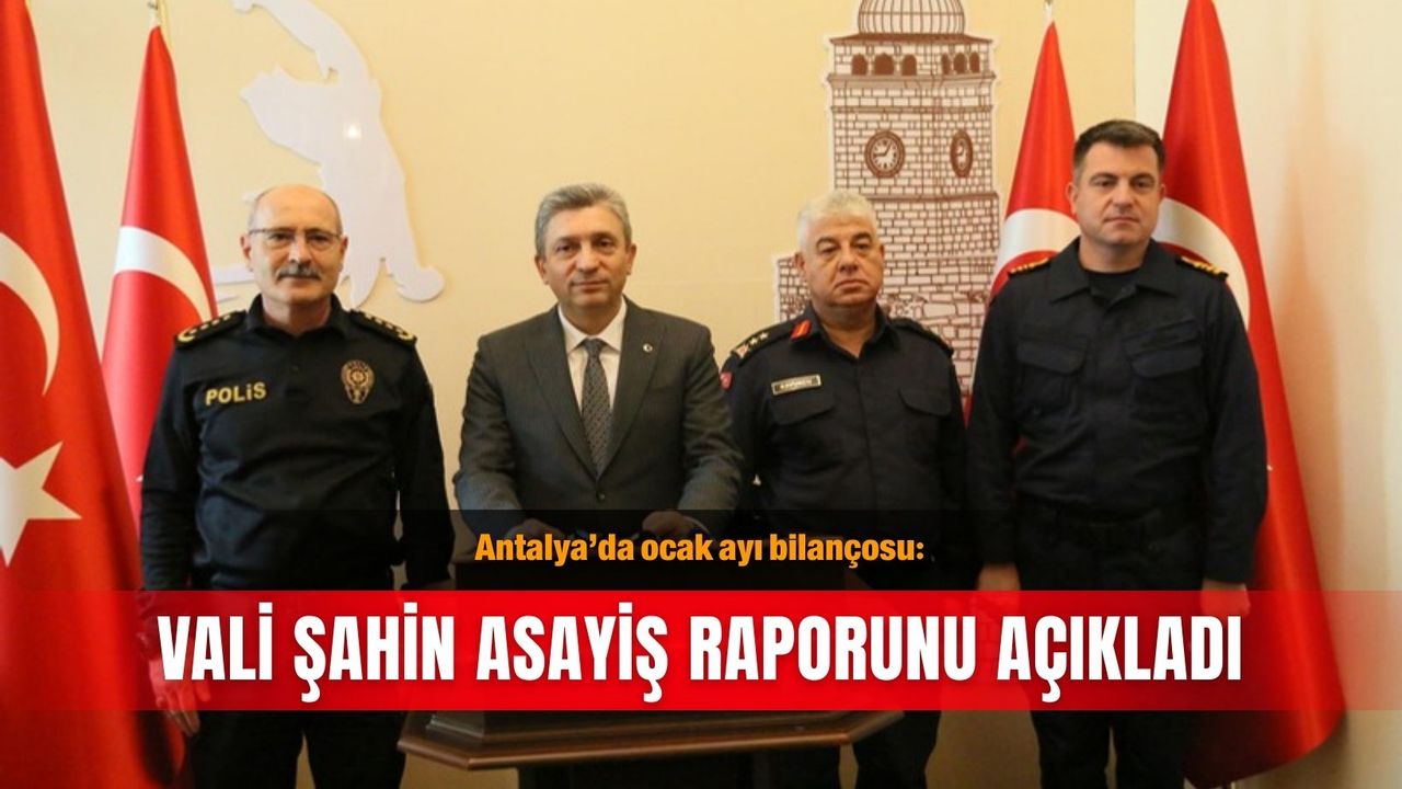 Toplantıya İl Emniyet Müdürü Sabit Akın Zaimoğlu, İl Jandarma Komutanı Tümgeneral Ahmet Kavukcu ve Sahil Güvenlik Antalya Grup Komutanı Yarbay Tolga Coşkun eşlik etti. Ocak ayında il genelinde 8 bin 534 olay meydana geldiğini belirten Vali Şahin, yüzde 99,3 aydınlatma başarısı elde ettiklerini söyledi. Bu olayların 2 bin 804'ü kişilere, 1176'sı mal varlığına, 108'i millete ve devlete olmak üzere 1485'inin topluma karşı meydana gelen olaylar olduğunu anlatan Şahin, “2 bin 961'i ise şikayete bağlı suçlardan oluşuyor. 5 bin 50 aranan şahıs yakalandı, 1015'i tutuklandı. 535 adet tabanca, 5 adet uzun namlulu silah, 81 adet av tüfeği, 27 adet kuru sıkı tabanca, 5 bin 392 adet fişek, 175 adet av tüfeği fişeği, 38 adet kesici alet, 19 adet çalıntı oto, 2 adet çalıntı kamyonet, 37 adet çalıntı motosiklet, 2 adet çalıntı elektrikli bisiklet, 2 milyon 419 bin 447 TL değerinde ziynet eşyası, 2,5 milyon TL nakit para ele geçirildi" dedi.