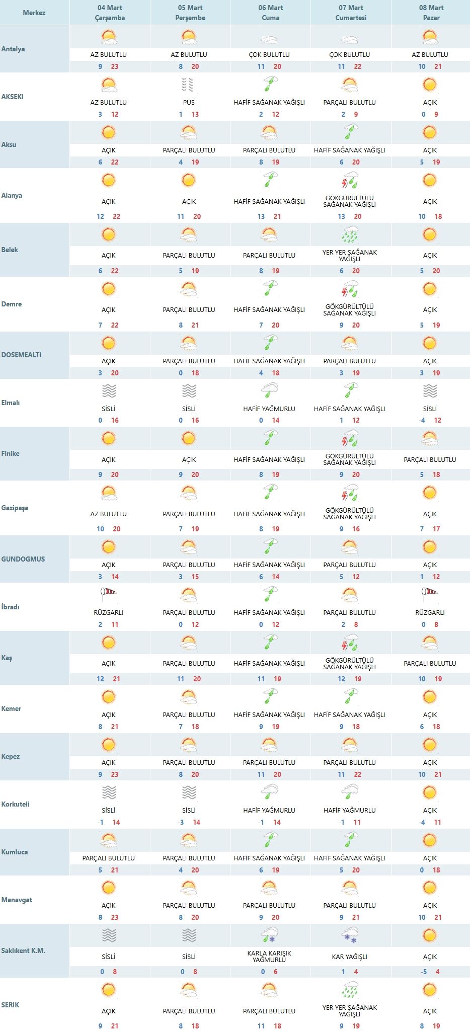 Antalya şehir merkezinde az bulutlu bir hava beklenirken, sıcaklık en düşük 9, en yüksek 23 dereceye kadar yükselecek. Kepez ve Manavgat ilçelerinde de termometrelerin 23 dereceyi göstermesi öngörülüyor. Alanya, Belek, Demre, Kaş ve Kemer gibi turizm merkezlerinde ise açık bir gökyüzü eşliğinde sıcaklıklar 21 ile 22 derece civarında seyredecek.
