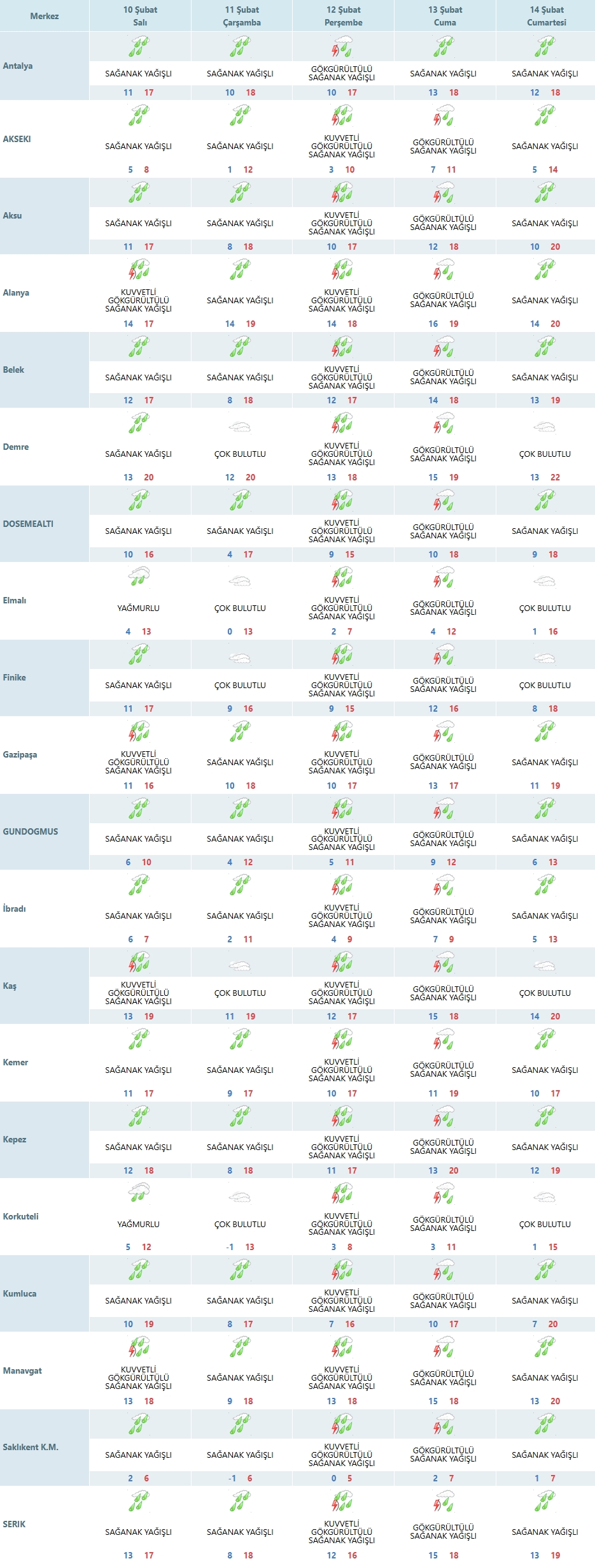 Bazı sahil ilçelerinde yağışın şiddeti daha fazla hissedilebilir. Alanya, Gazipaşa, Kaş ve Manavgat hattında kuvvetli gök gürültülü sağanak yağış bekleniyor.