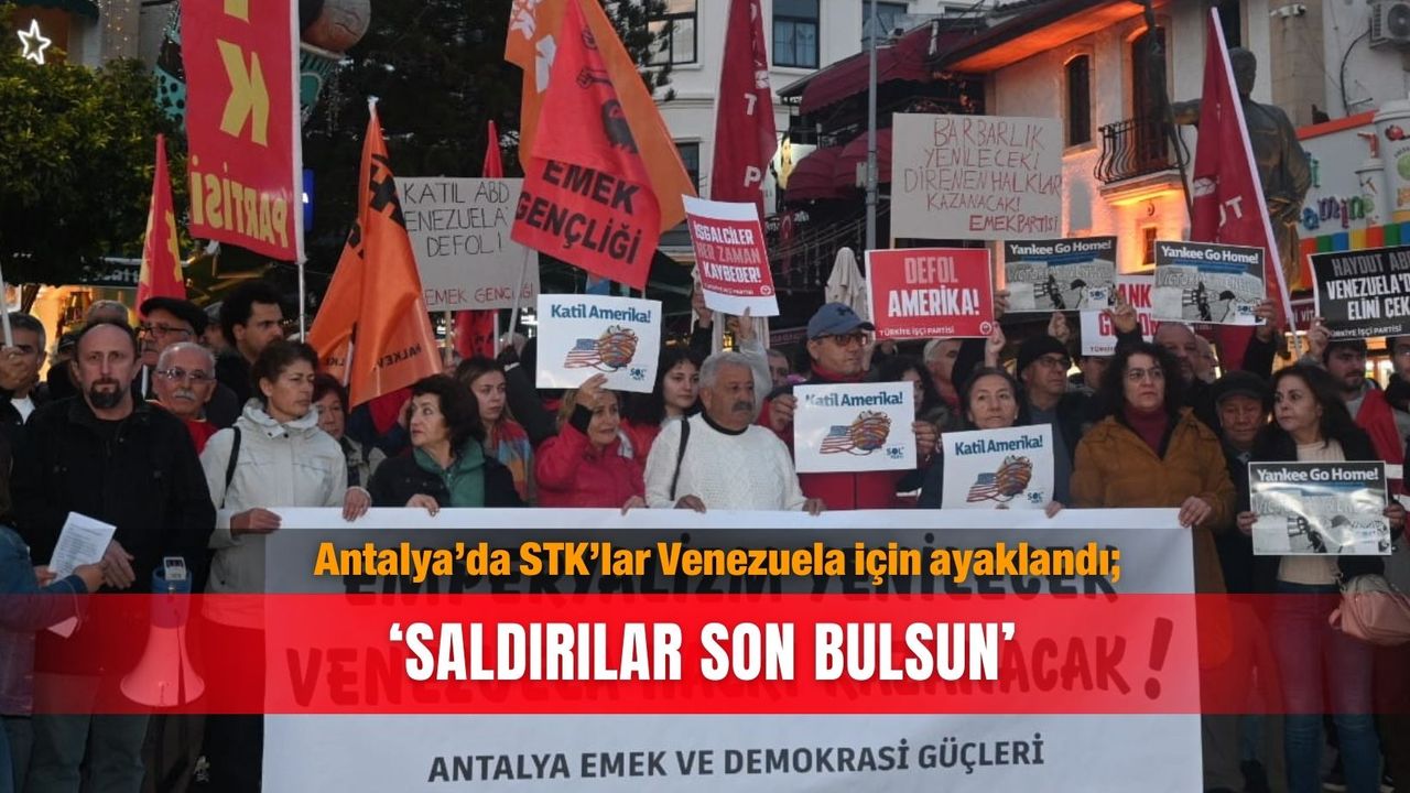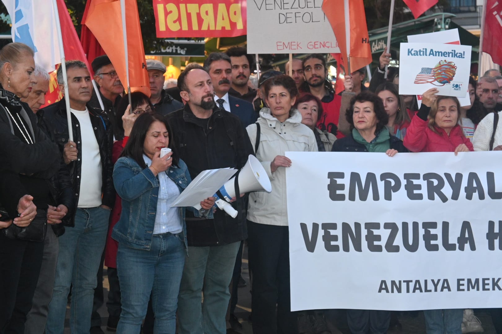 ABD’nin Venezuela’ya karşı gerçekleştirdiği askeri saldırılar Antalya’da protesto edildi. Antalya’daki Sivil Toplum Kuruluşları, Attalos Meydanı’nda bir araya gelerek basın açıklaması düzenledi. Açıklamaya Cumhuriyet Halk Partisi (CHP) Antalya İl Başkanı Nail Kamacı’nın yanı sıra Özgür Üniversite Hareketi Halk Evleri, Türkiye İşçi Partisi (TİP) Antalya, Emek Partisi, Sosyalist Yeniden Kuruluş Partisi (SYKP), Kamu Emekçileri Sendikaları Konfederasyonu (KESK) Antalya Şubesi ve SOL Parti katıldı. Antalya Emek ve Demokrasi Güçleri adına basın açıklamasını KESK Antalya Şubeler Platformu Dönem Sözcüsü Devrim Mol okudu. Mol, ABD’nin 2 Ocak’ta Venezuela’ya yönelik doğrudan askeri saldırı ve bombalama gerçekleştirdiğini belirterek, bu saldırıların derhal son bulması gerektiğini söyledi.