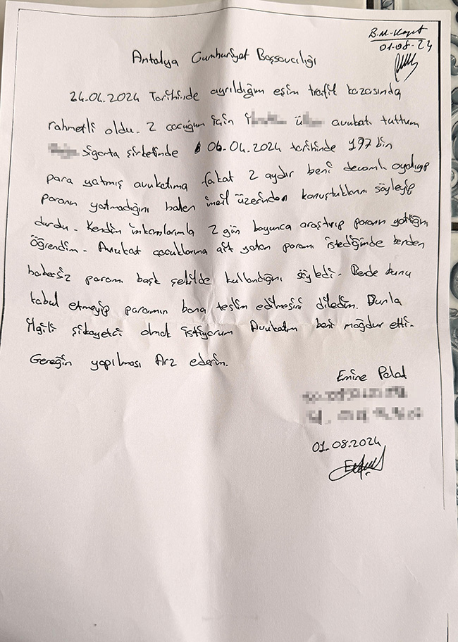 Emine Polat, boşandığı eşinin 24 Nisan 2024 tarihinde trafik kazasında hayatını kaybetmesinin ardından müşterek çocukları adına sigorta tazminatının tahsili için avukat tuttu. Polat, tuttuğu avukatın hesabına sigortadan yatırılan 197 bin liranın, yaklaşık 2 yıldır kendisine ödenmediği iddiasıyla şikayetçi oldu.