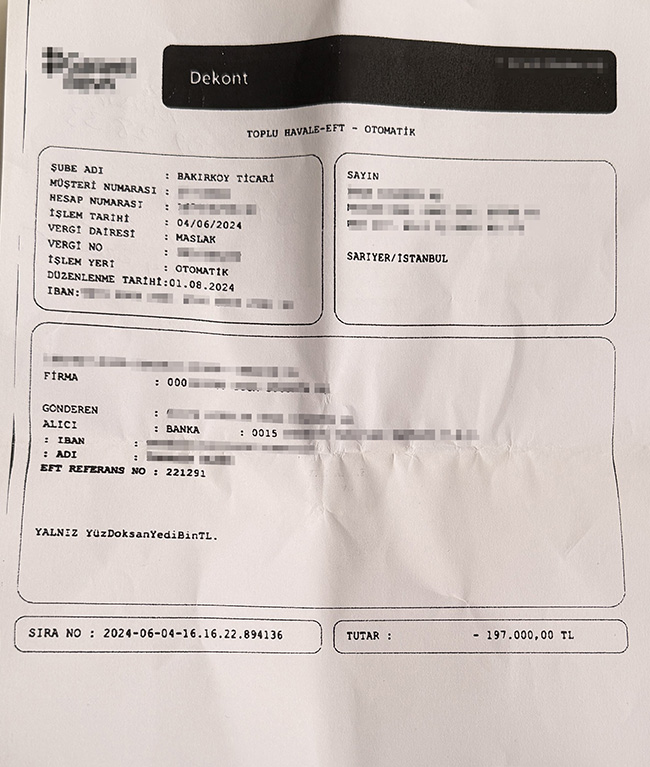 Süreçle ilgili bilgi almak istediğinde avukatın kendisini çeşitli gerekçelerle oyaladığını ileri süren Polat, ilgili sigorta şirketi nezdinde yaptığı araştırmada, 4 Haziran 2024 tarihinde 197 bin TL'nin avukatın hesabına yatırıldığını öğrendiğini söyledi. Sigorta şirketinden dekont örneğini de temin ettiğini belirten Polat, belgenin dosyaya alındığını kaydetti.