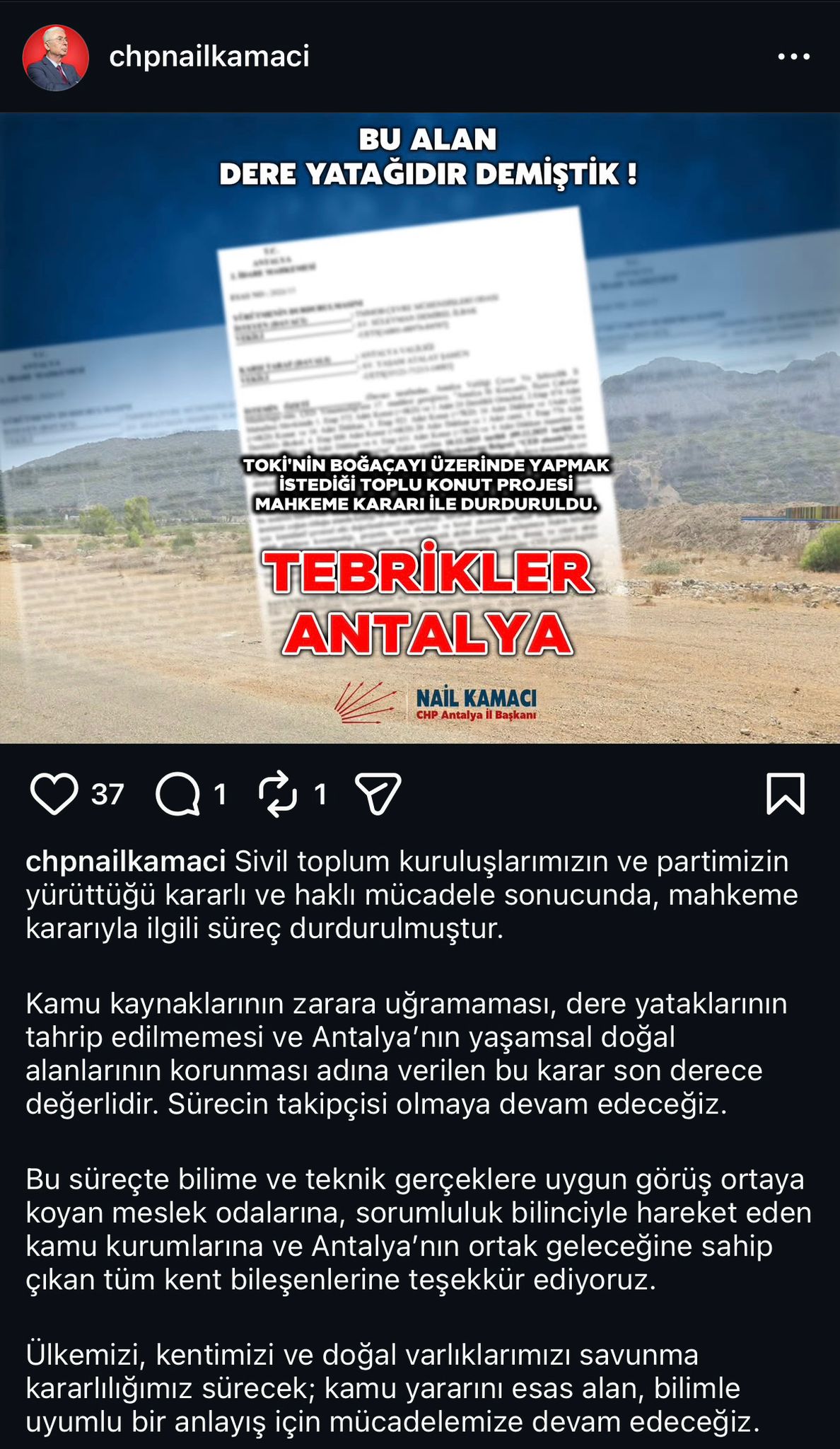 Kamacı, kararın sivil toplum kuruluşları ve meslek odalarının yürüttüğü hukuki mücadele sonucunda alındığını belirterek, “Bu alanın dere yatağı olduğunu söylemiştik. Kamu kaynaklarının zarara uğramaması ve Antalya’nın doğal yaşam alanlarının korunması adına verilen karar son derece değerlidir” ifadelerini kullandı.