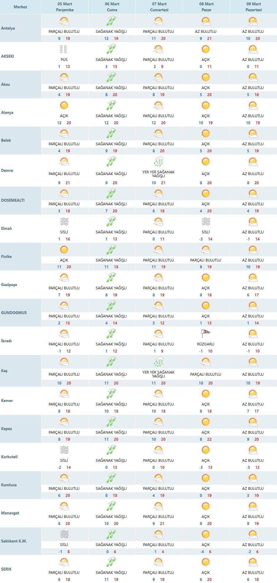 Antalya şehir merkezinde sıcaklık en düşük 9, en yüksek 19 derece olacak ve gökyüzü parçalı bulutlu seyredecek. Alanya ve Finike ilçelerinde gökyüzünün açık olması beklenirken sıcaklıklar 20 derece seviyelerinde kalacak. Demre ve Kaş'ta ise parçalı bulutlu bir hava eşliğinde sıcaklıkların 20-21 derece civarında seyretmesi öngörülüyor. Aksu, Belek ve Manavgat'ta sıcaklıkların 19-20 derece bandında olacağı tahmin edilmektedir.