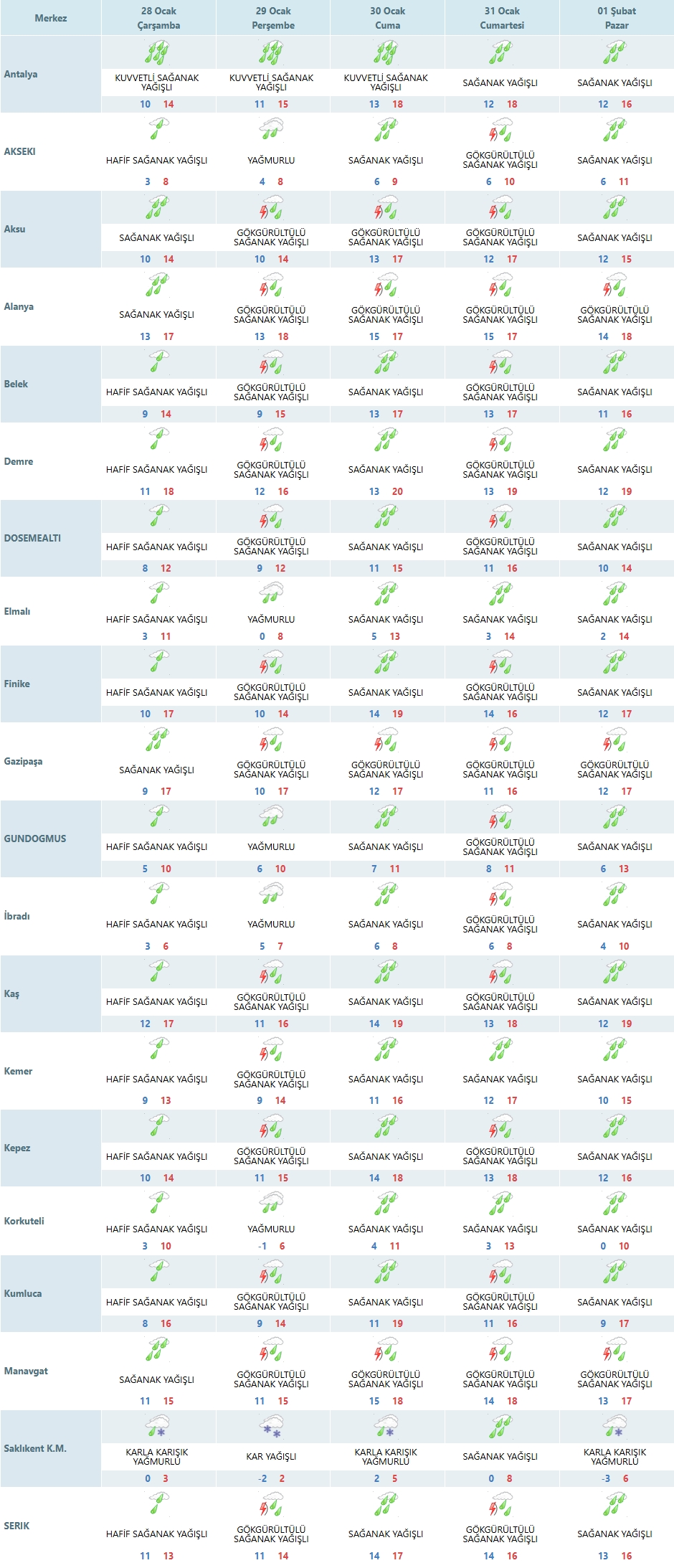 Sağanak Yağışlı Bölgeler: Aksu (10-14°C), Alanya (13-17°C), Gazipaşa (9-17°C) ve Manavgat (11-15°C) hattında sağanak yağışlar gün boyu sürecek.