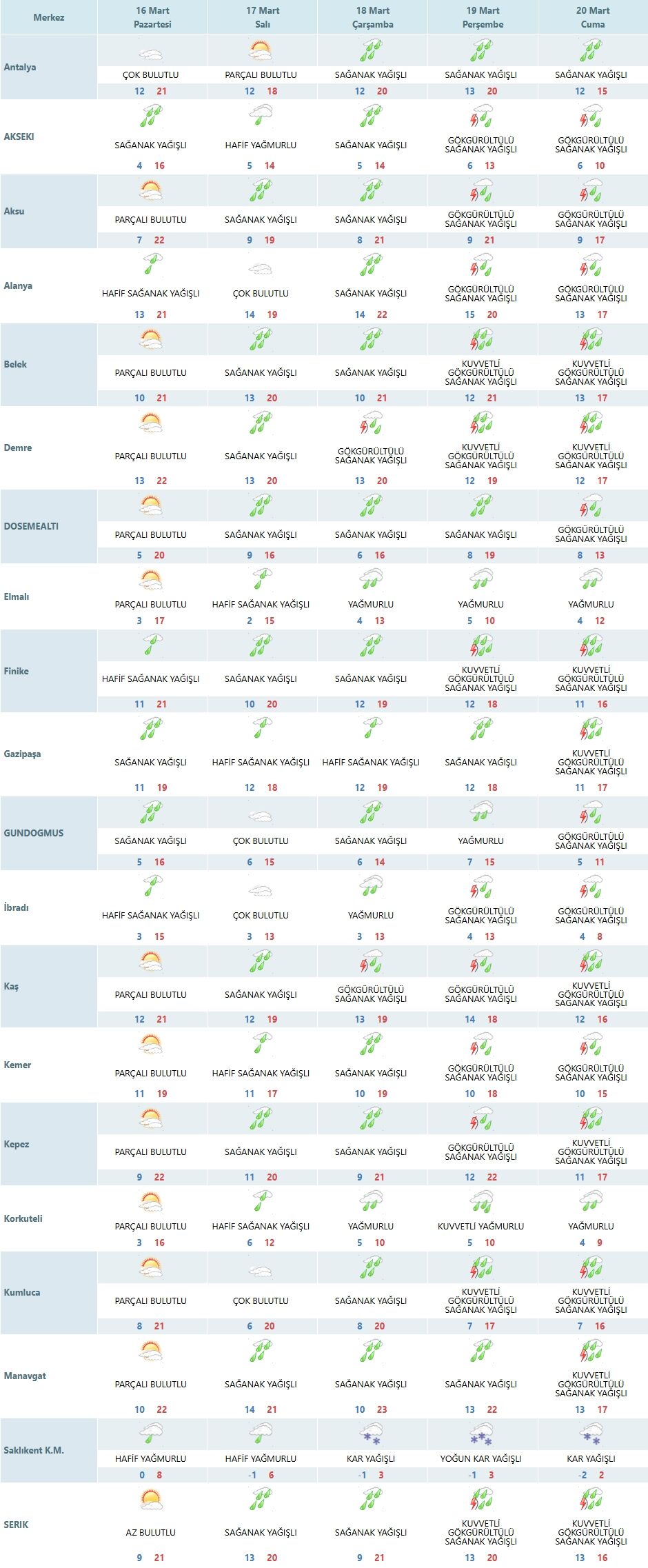 Antalya merkezde 16 Mart Pazartesi hava durumu